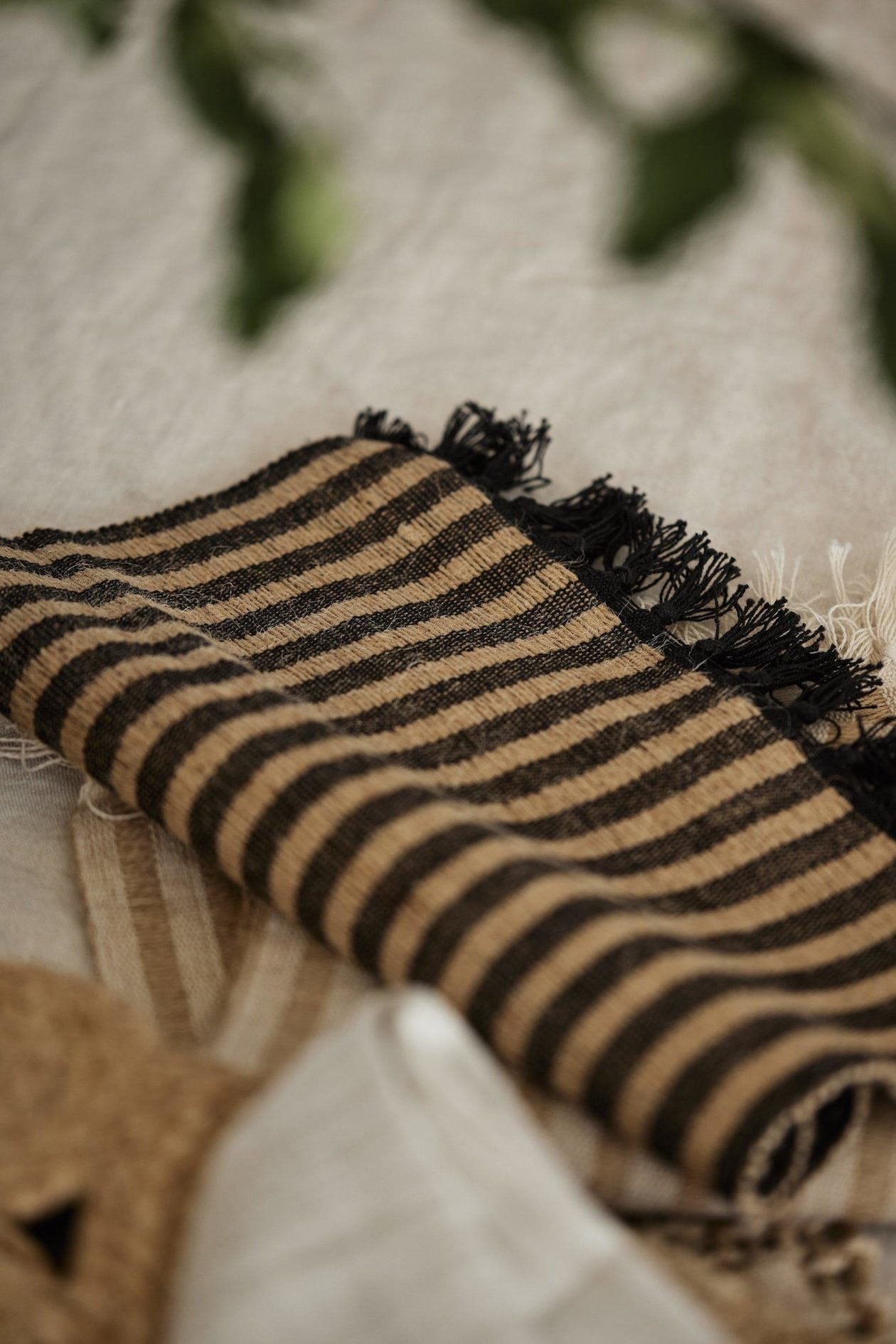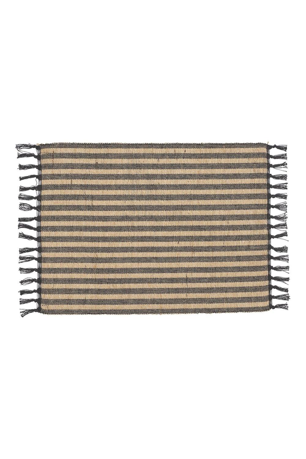 Четырёхсекционный тканый коврик под прибор с вертикальным узором, изготовленный из хлопчатобумажной/джутовой пряжи с бахромой. Размеры: 33 x 45 см без учёта бахромы. Изделие сертифицировано по стандарту OEKO-TEX® STANDARD 100. Этот сертификат гарантирует, что изделие прошло испытания и не содержит веществ, вредных для здоровья и окружающей среды.
