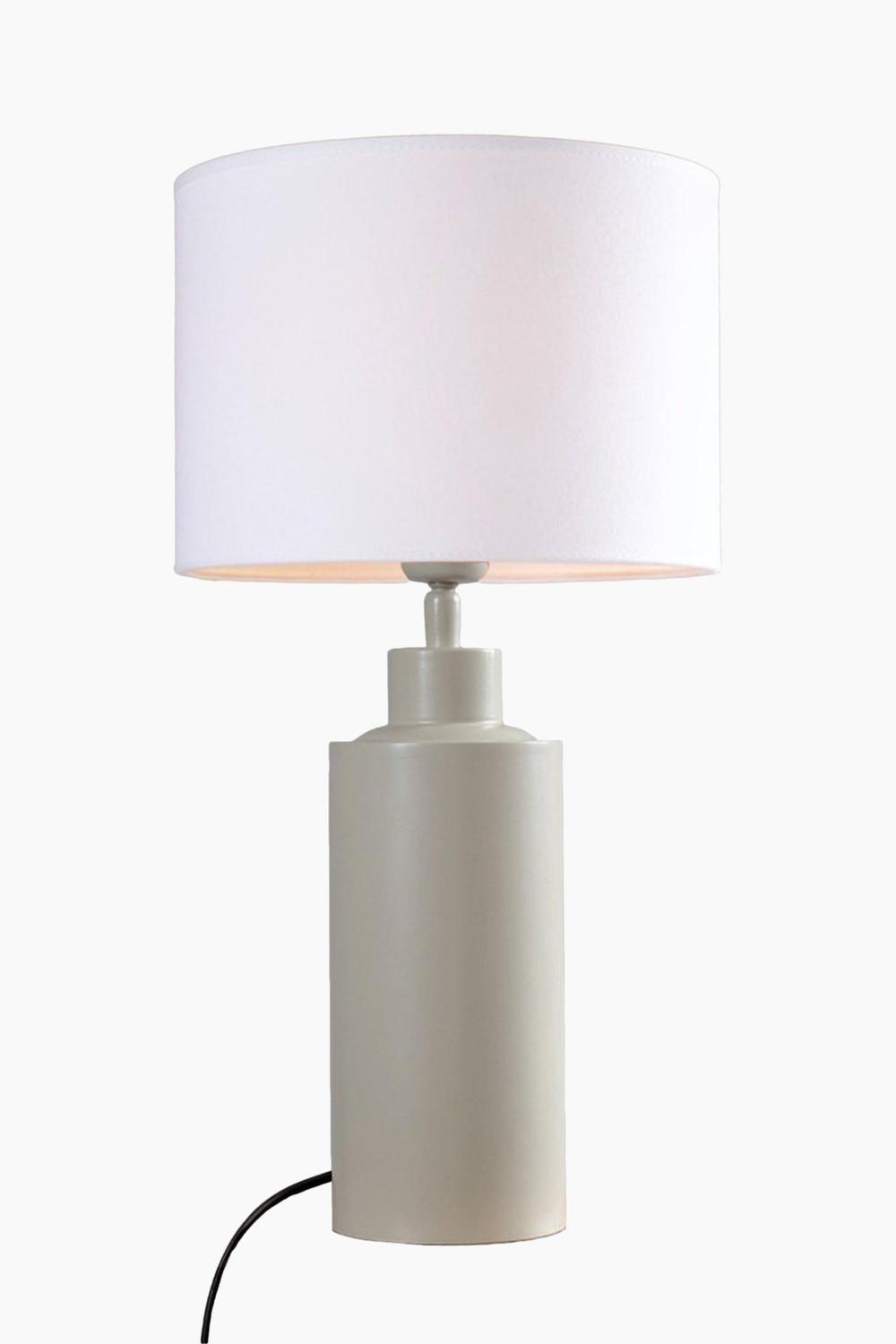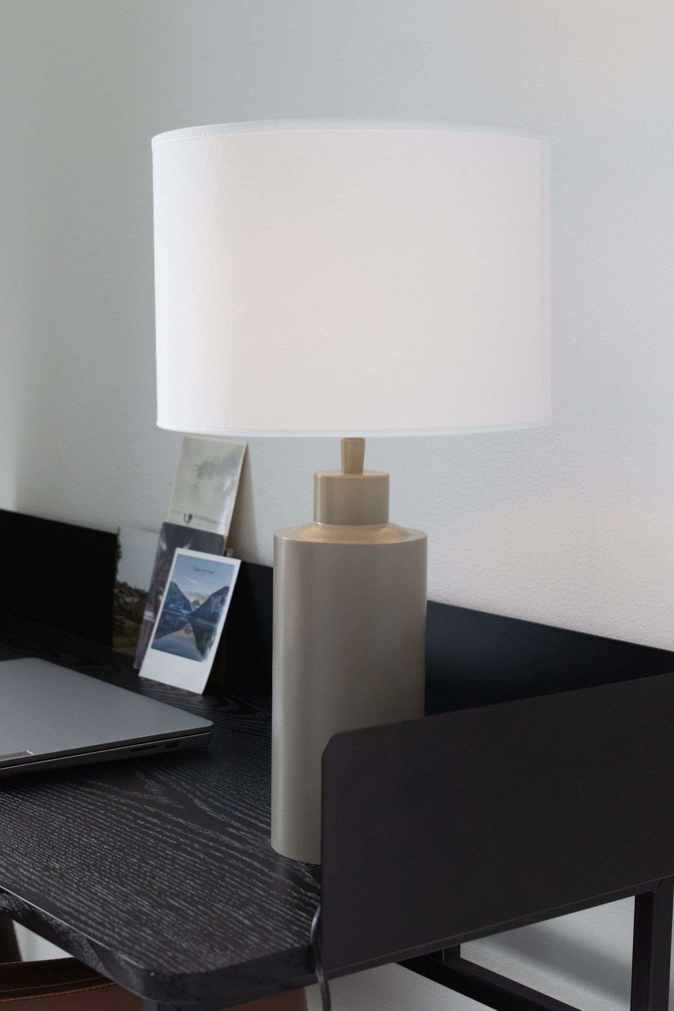 Отдельно стоящая лампа с матово-черным покрытием и цилиндрическим белым абажуром.