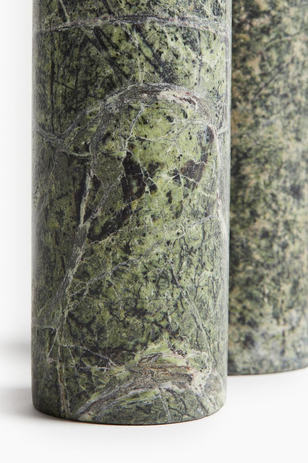 Эта элегантная цилиндрическая солонка и перечница изготовлена из мрамора. Этот набор станет практичным и стильным дополнением к интерьеру вашей кухни. Мрамор — натуральный материал, поэтому цвет отдельных предметов может отличаться.