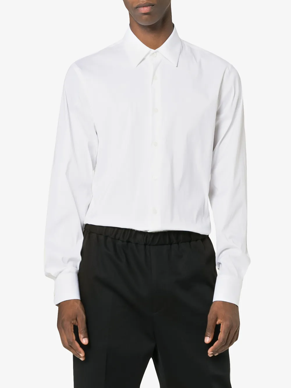 Подробнее о товаре: Итальянский модный дом Prada (Прада) сочетает в своих коллекциях классический дизайн и современные решения, высокое качество и инновационные тренды. В коллекцию осень-зима 2020 вошла белая рубашка на пуговицах, выполненная из эластичного хлопка. Она имеет заостренный воротник, застежку на пуговицах спереди, длинные рукава, манжеты на пуговицах и закругленный подол.