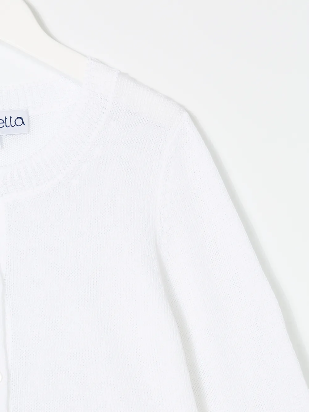 Белый хлопковый кардиган на пуговицах с оборками от Simonetta. Круглый вырез под горло в рубчик, застежка на пуговицах спереди, длинные рукава, манжеты в рубчик, французская вышивка, волнистый подол, серебристая бляшка с логотипом.