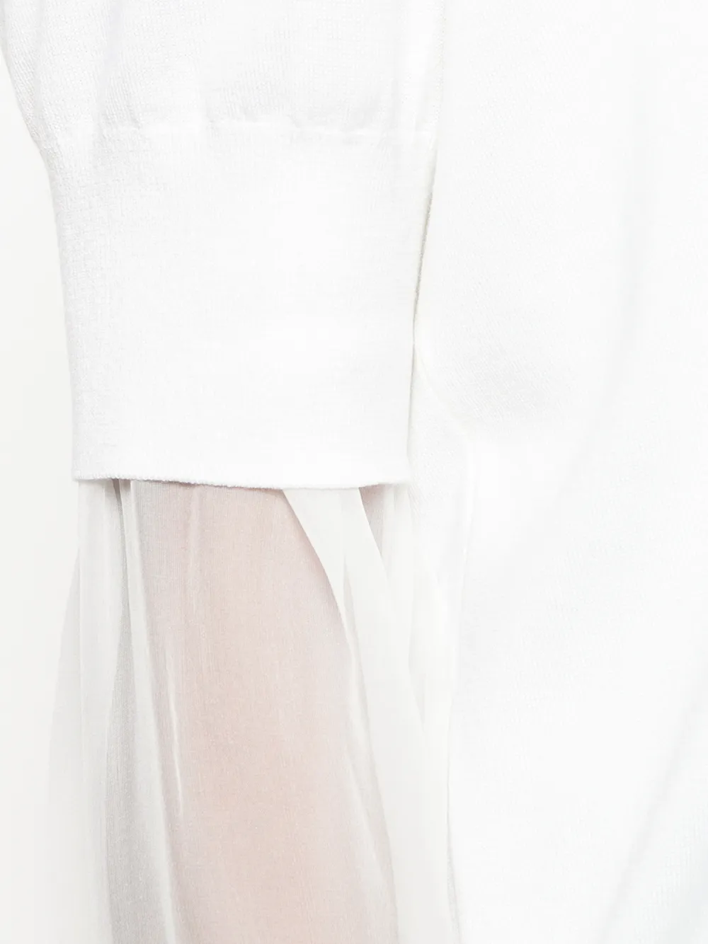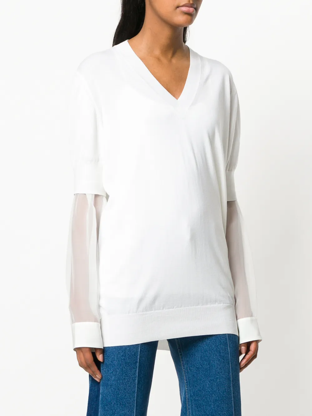 Белый шелково-шерстяной свитер с прозрачными рукавами от Givenchy(Живанши). Многослойный дизайн, вязаная модель, V-образная горловина в рубчик, рукава по локоть, длинные прозрачные рукава, подол и манжеты в рубчик.