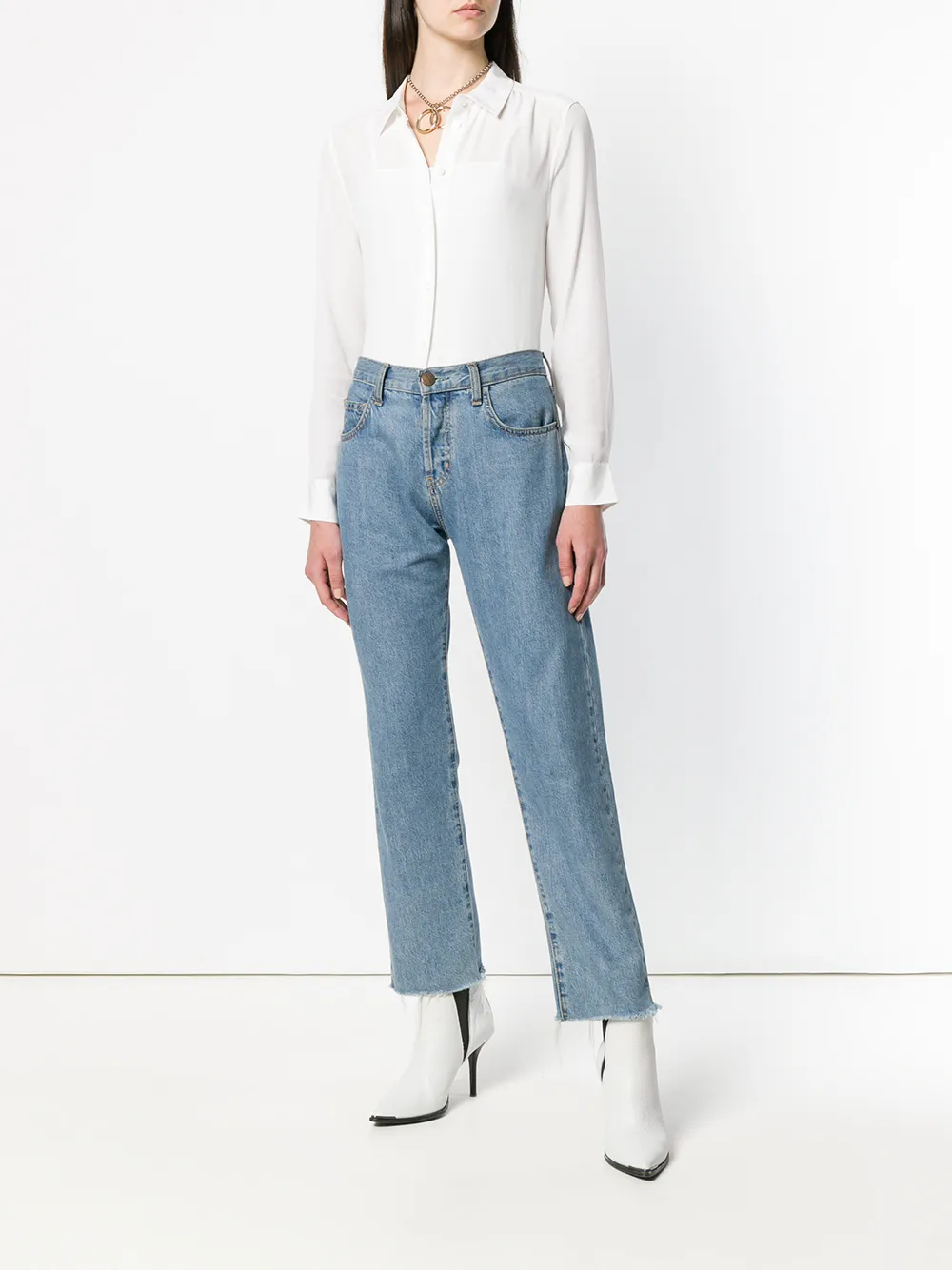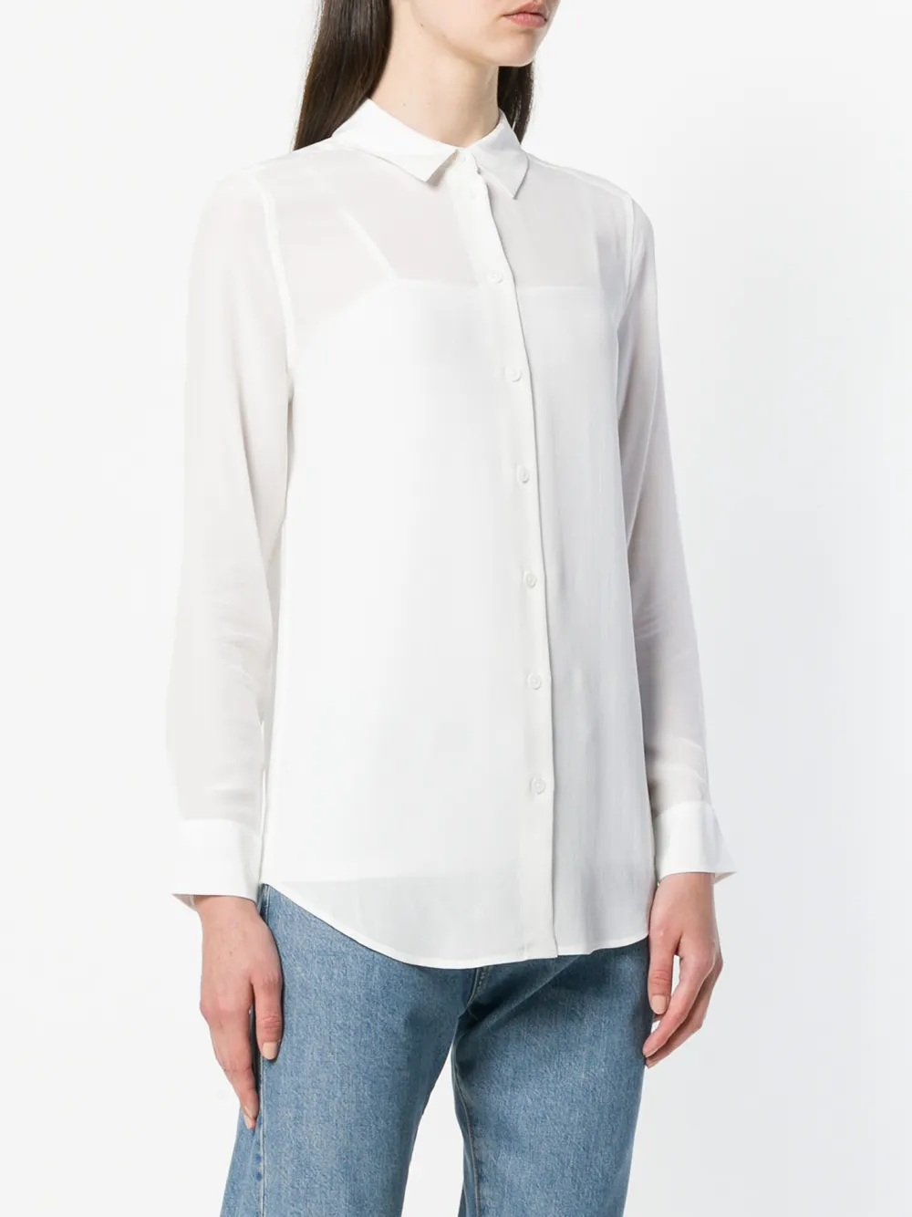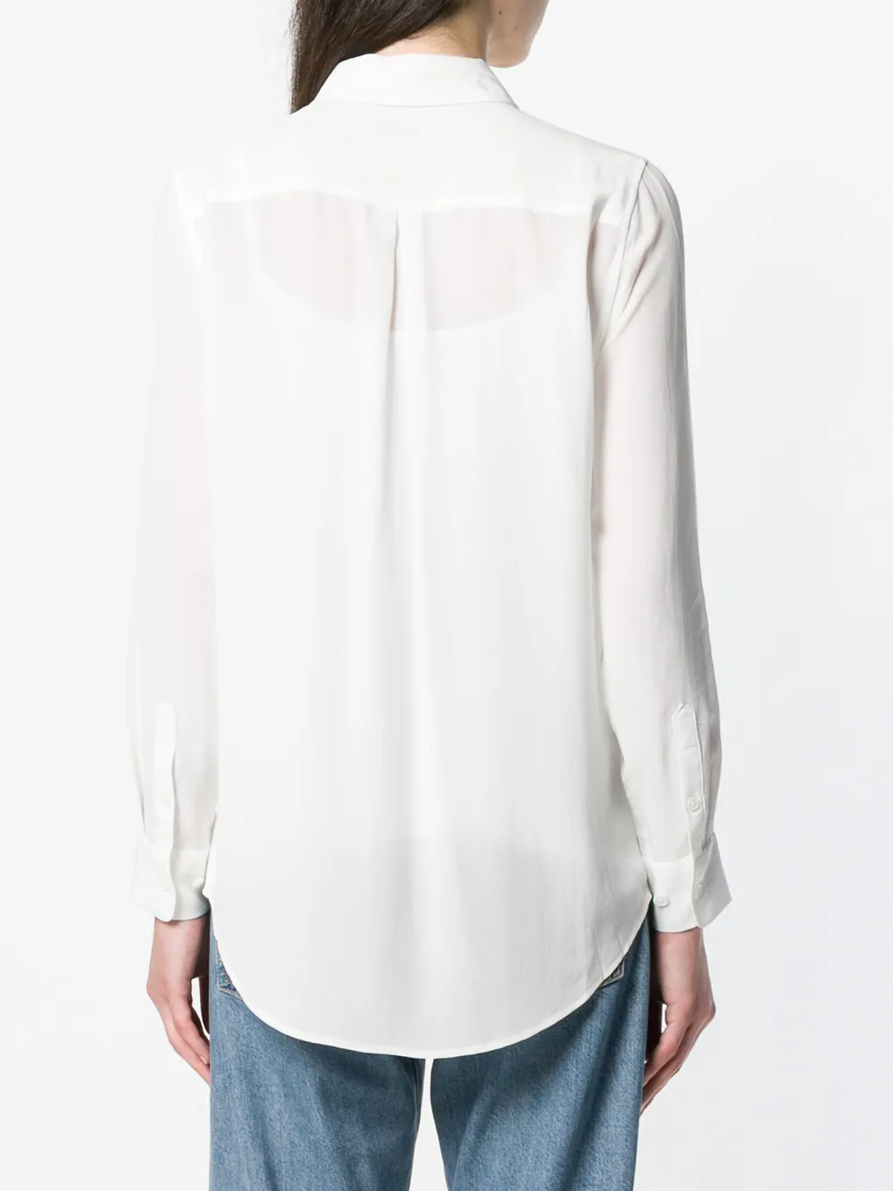 Белая шелковая рубашка Essentail от Equipment. Классический воротник, длинные рукава, манжеты на пуговицах, застежка на пуговицах спереди, закругленный подол.