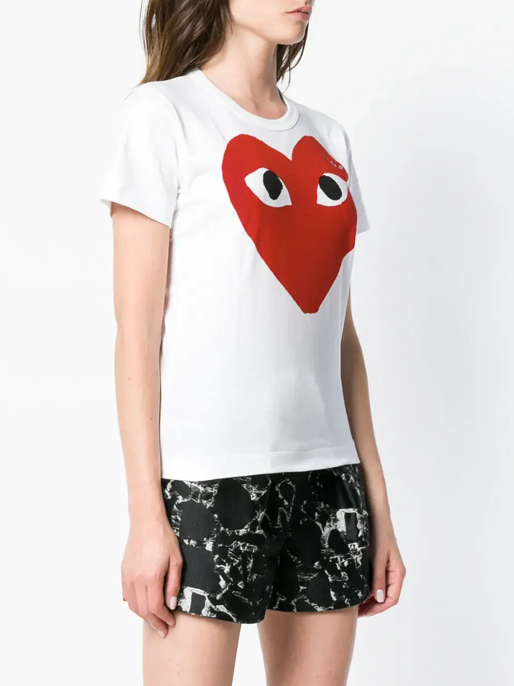 Белая хлопковая футболка с принтом сердца от Comme Des Garçons Play. Круглый вырез, короткие рукава, графический принт.