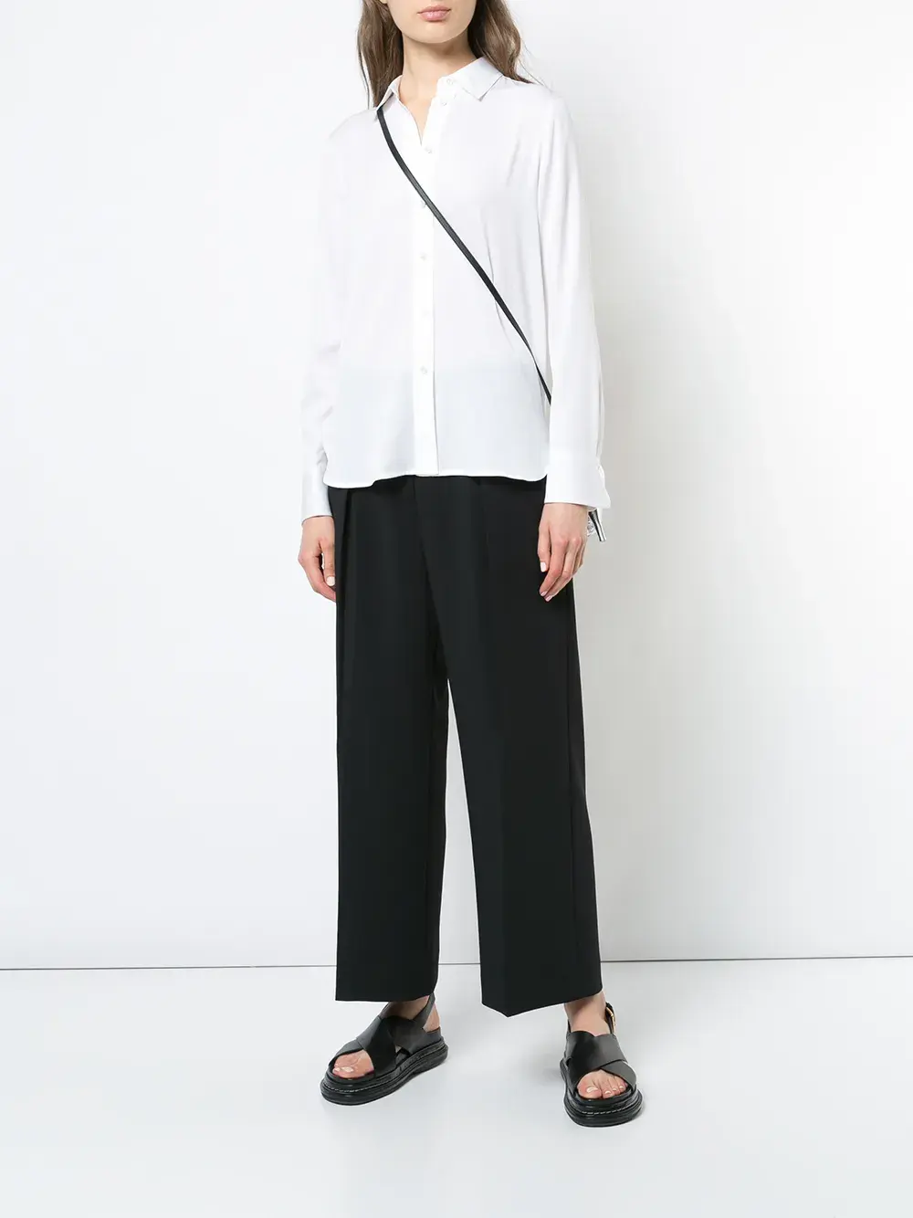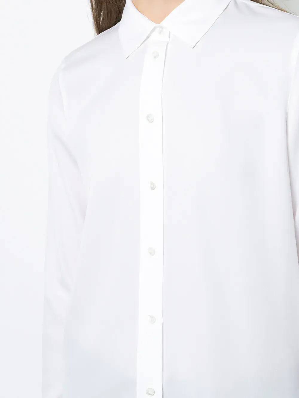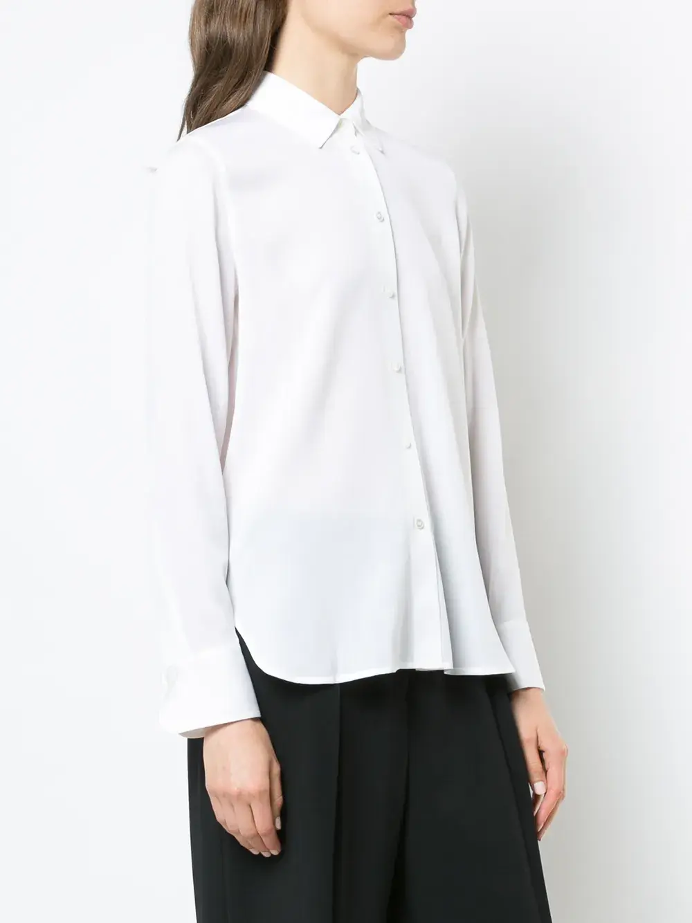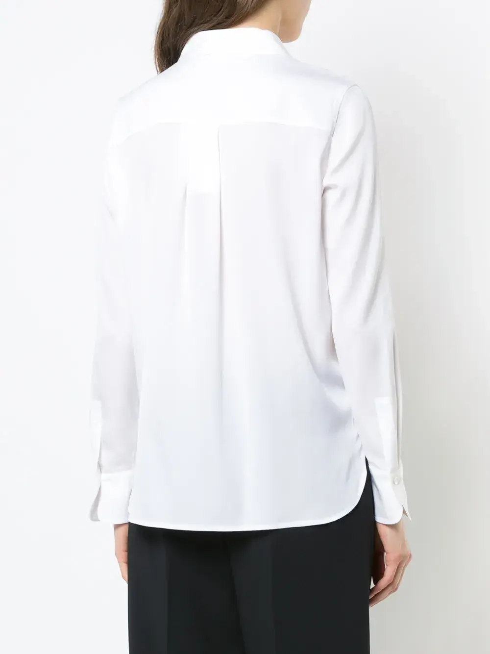 Белая эластичная шелковая классическая рубашка от Vince(Винс). Классический воротник, застежка на пуговицах спереди, длинные рукава, манжеты на пуговицах, свободный силуэт, прямой подол.