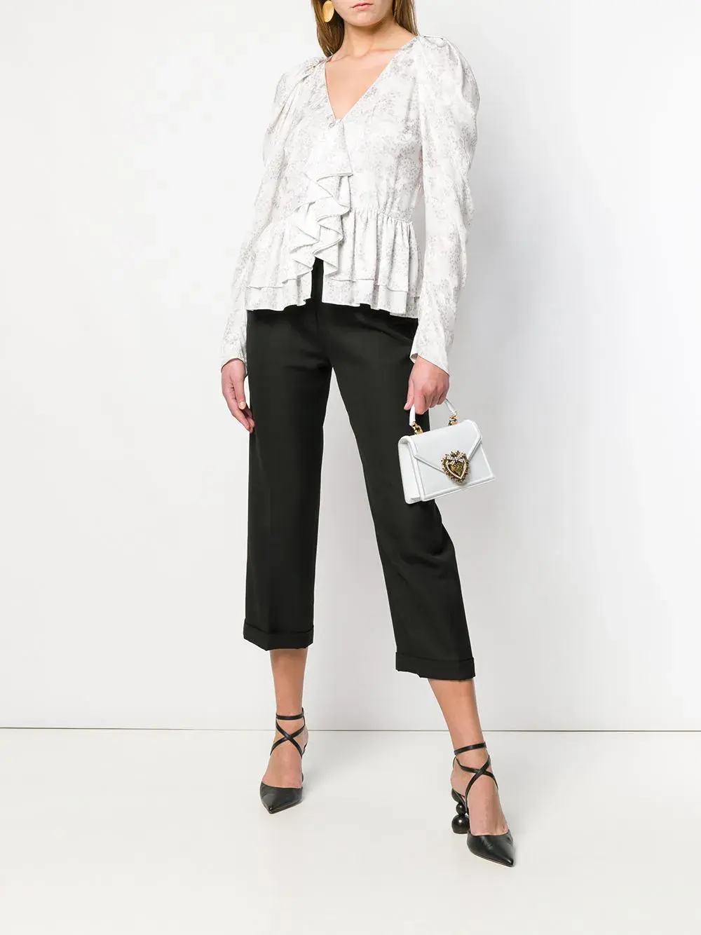 Показ коллекции Dolce & Gabbana весна-лето 2019 представил публике женственные модели с ярким декором. Среди них белая кожаная сумка-тоут Devotion размера мини. Верхняя ручка, золотистая фурнитура, откидной клапан, деталь в форме сердца с гравировкой, декор из искусственного жемчуга.