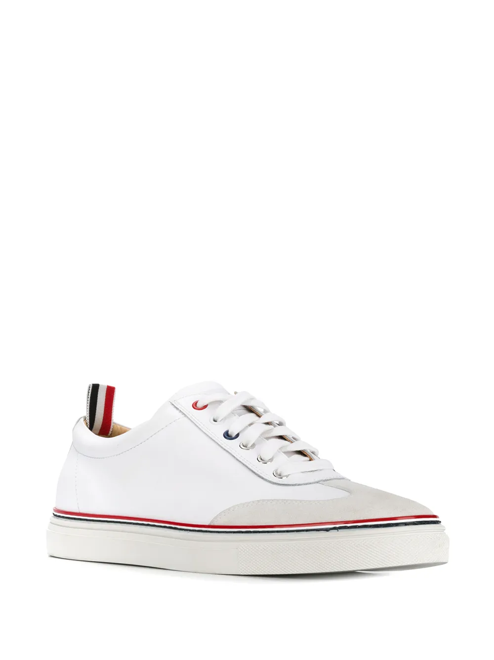 Кеды на резиновой подошве от THOM BROWNE. Закругленный носок, контрастный носок, шнуровка спереди, плоская резиновая подошва и фирменная трехцветная полоска. Цвет: белый.