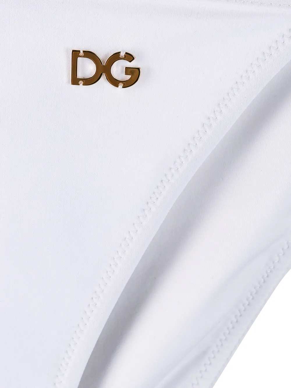 Dolce & Gabbana - яркий пример успешного союза классического итальянского стиля и сицилийской экспрессии. В коллекцию бренда вошли белые плавки бикини от Dolce & Gabbana (Дольче энд Габбана). Боковые завязки, логотип спереди, завышенный вырез по ноге. Примерка купальников разрешена только поверх собственного нижнего белья.