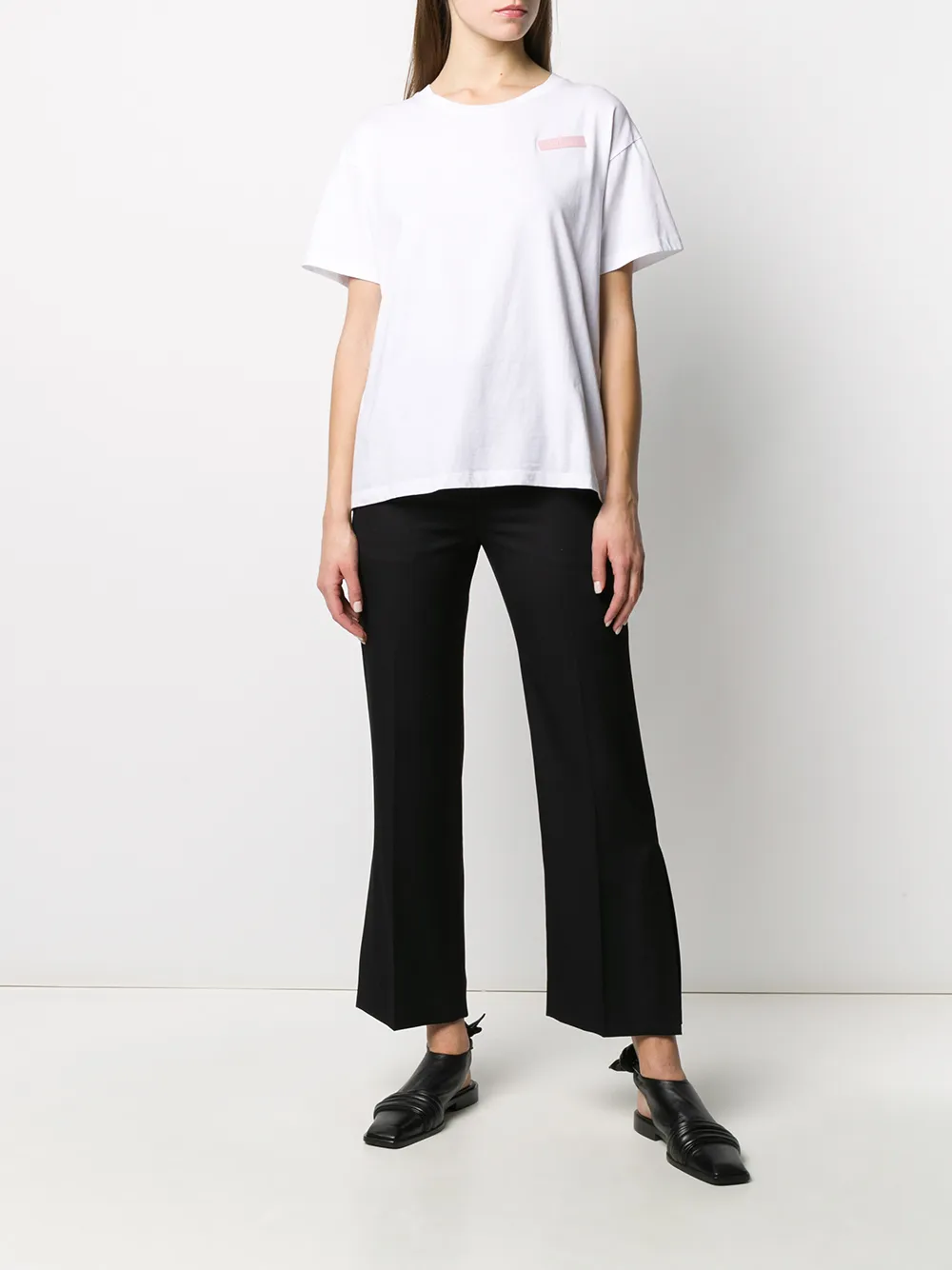 Футболка с нашивкой-логотипом от Nina Ricci (Нина Ричи). Круглый вырез, короткие рукава, свободный крой и прямой подол.