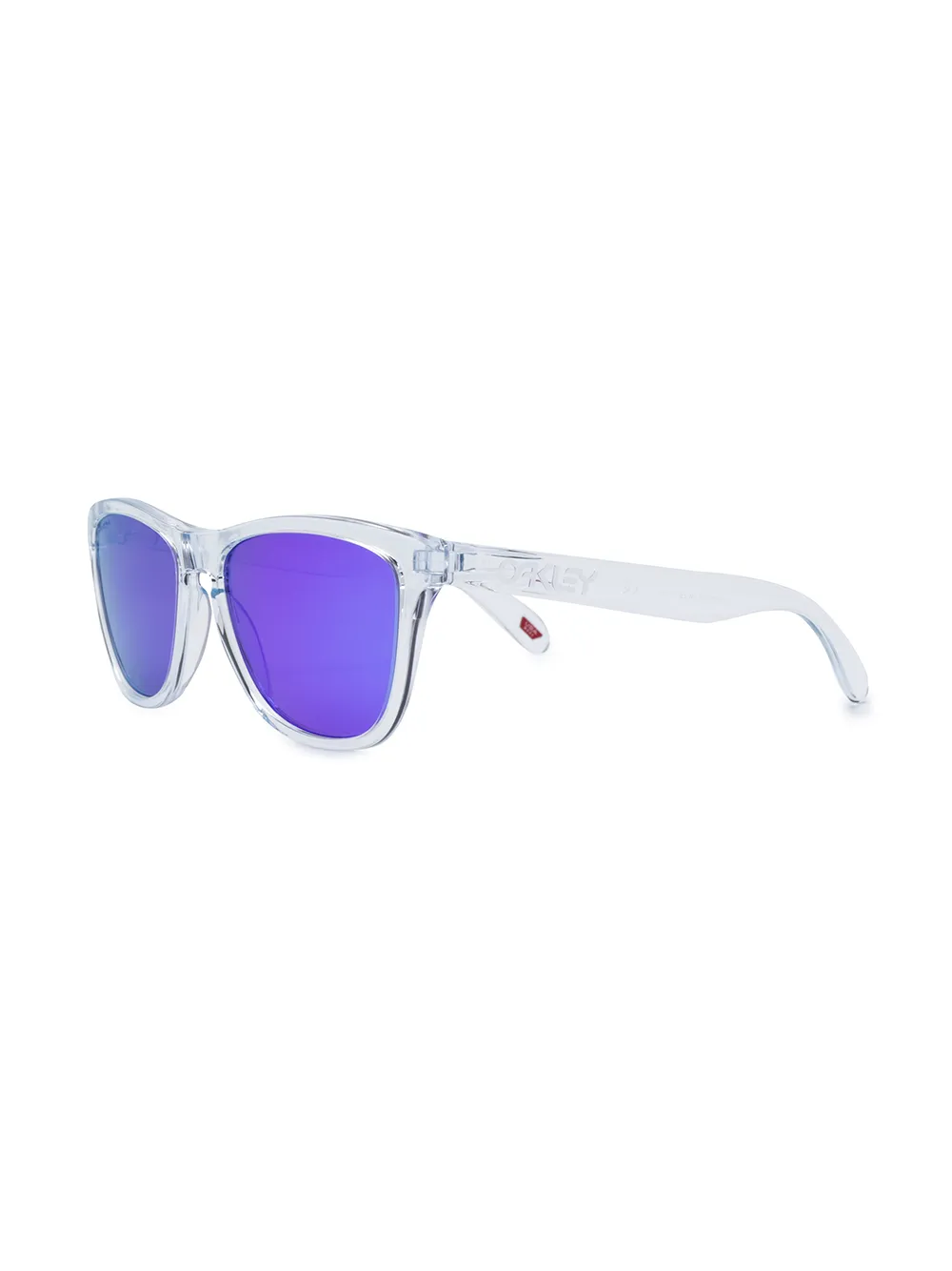 Солнцезащитные очки в прозрачной оправе от Oakley. Зеркальные линзы, прямой мост, тисненый логотип сбоку и прямые дужки с изогнутыми концами. Прилагается защитный чехол.