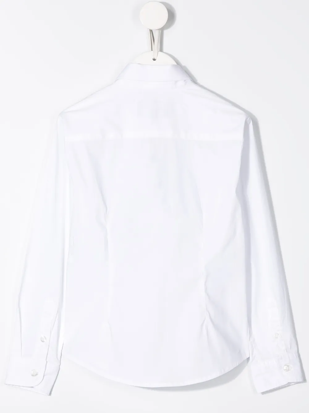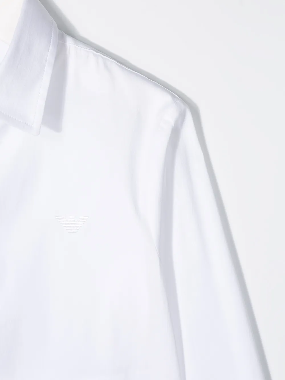 Рубашка с вышитым логотипом от Emporio Armani Kids. Вышитый логотип на груди, заостренный воротник, застежка на пуговицах спереди, длинные рукава и закругленный подол. Цвет: белый.