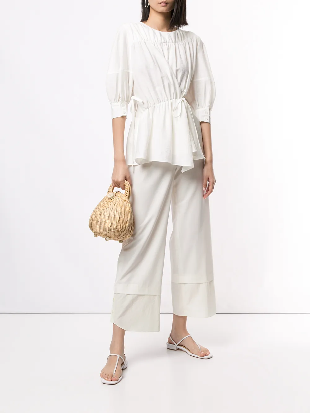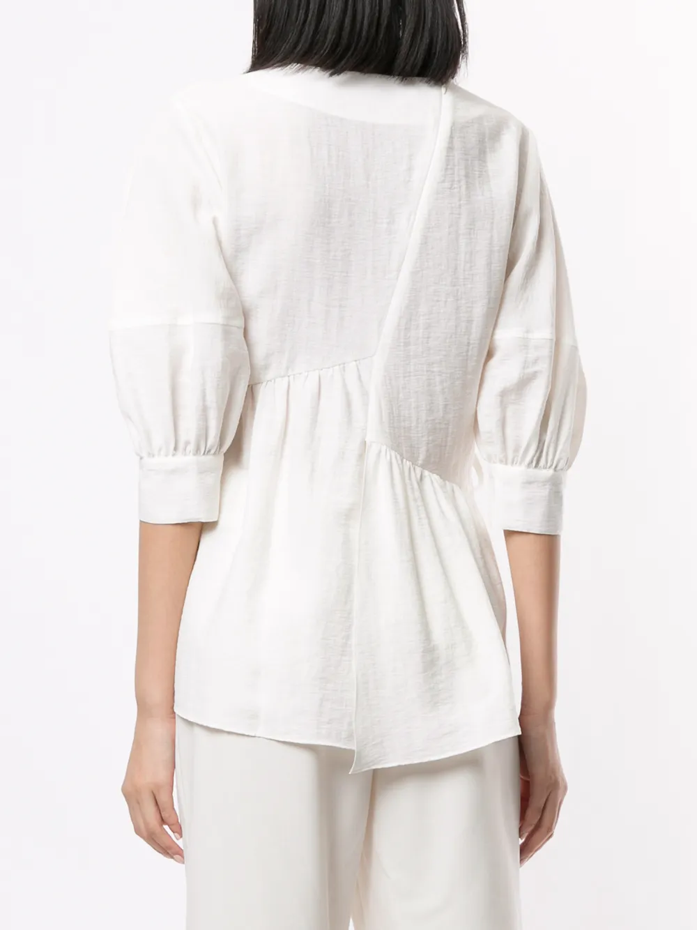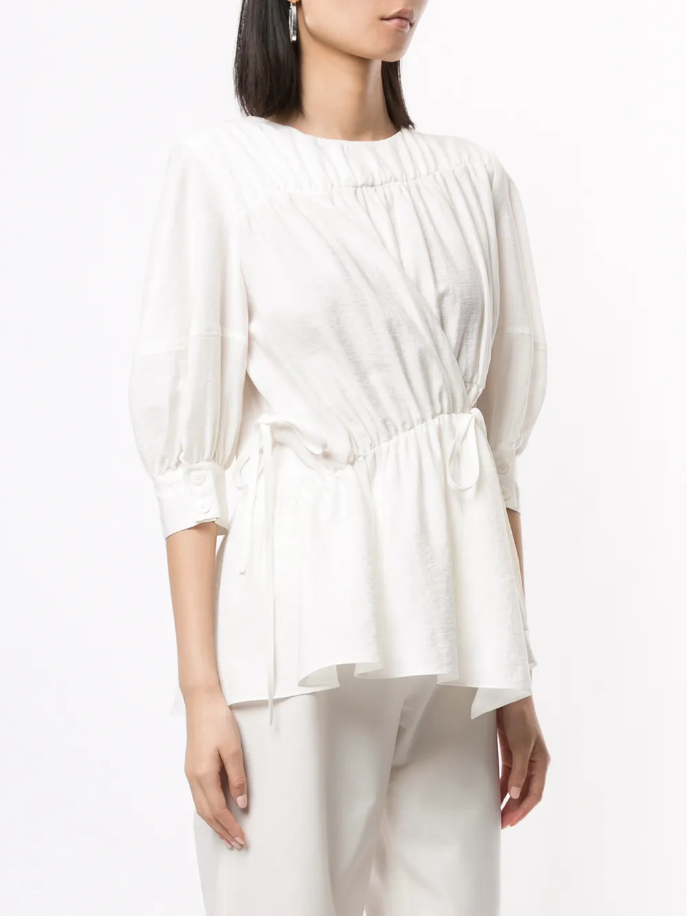 Блузка со сборками от Goen.J. Круглый вырез, рюши сбоку, застежка на шнурке, укороченные рукава, манжеты с разрезами и асимметричный силуэт.