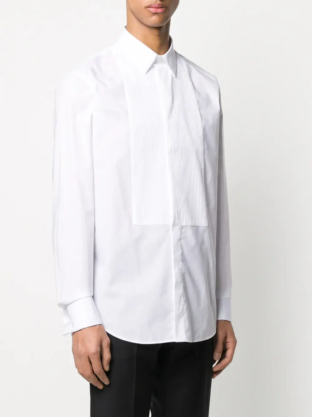 Рубашка с манишкой от Giorgio Armani (Джорджо Армани). Заостренный воротник, плиссированный нагрудник, застежка на пуговицах спереди, длинные рукава и узкий крой. Цвет: белый.
