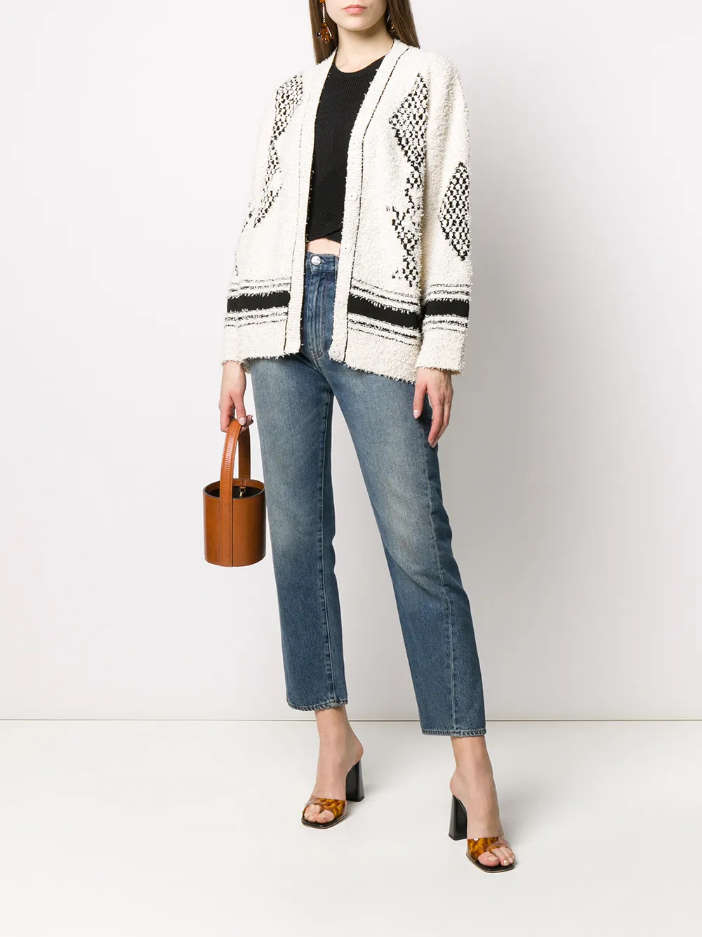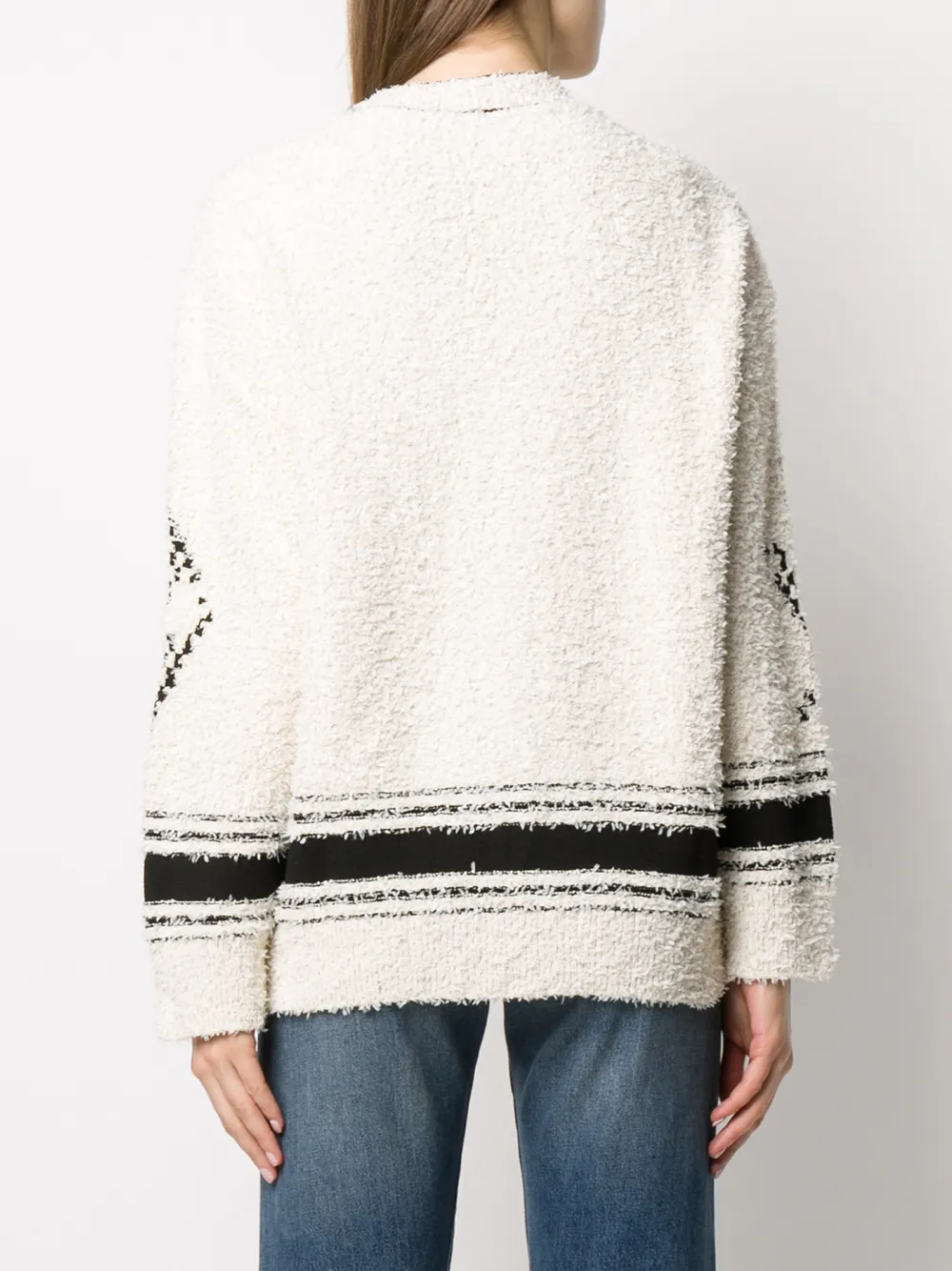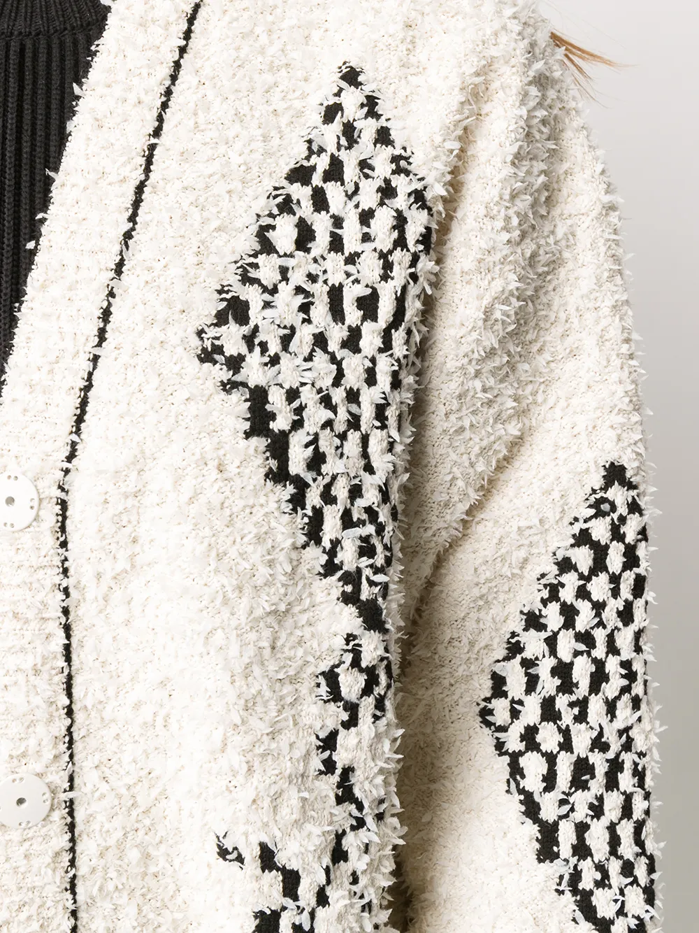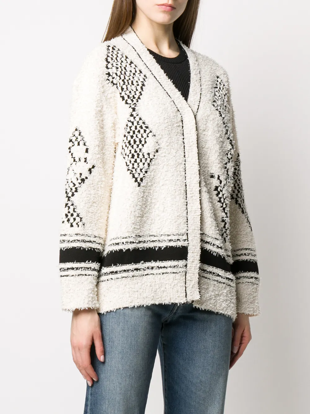 Кардиган оверсайз с V-образным вырезом от MRZ. Геометрический принт, V-образная горловина, потайная застежка спереди, приспущенные плечи и длинные рукава.