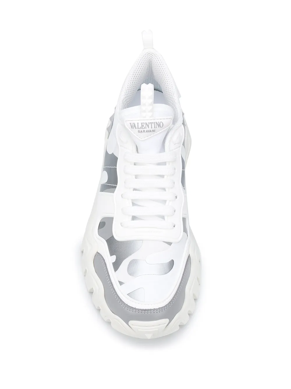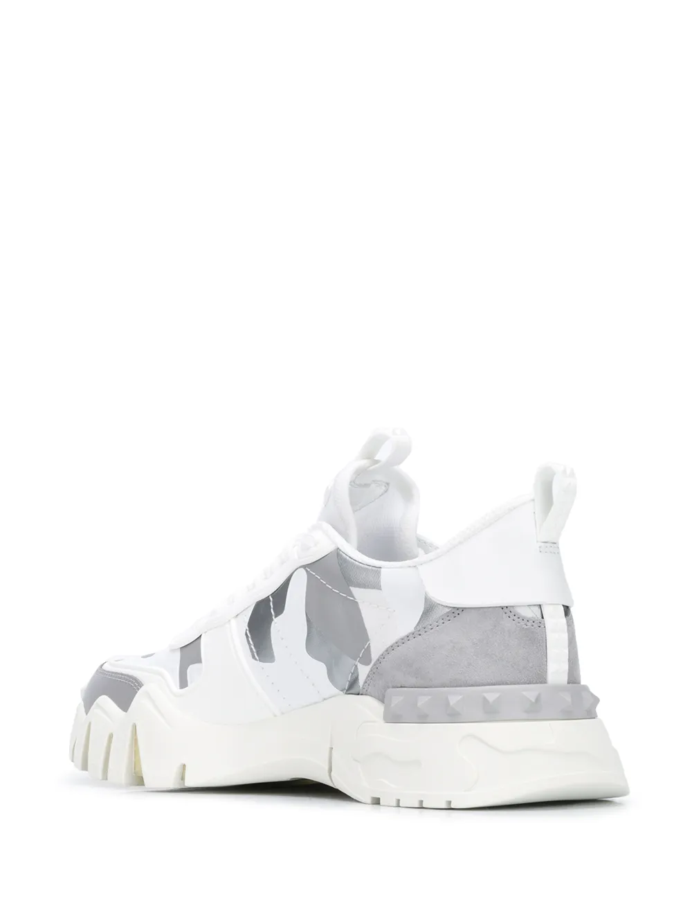 Камуфляжный принт, заклепки Rockstud, ребристая резиновая подошва, шнуровка спереди, нашивка с логотипом на язычке, петля для подтягивания сзади и ребристая резиновая подошва.