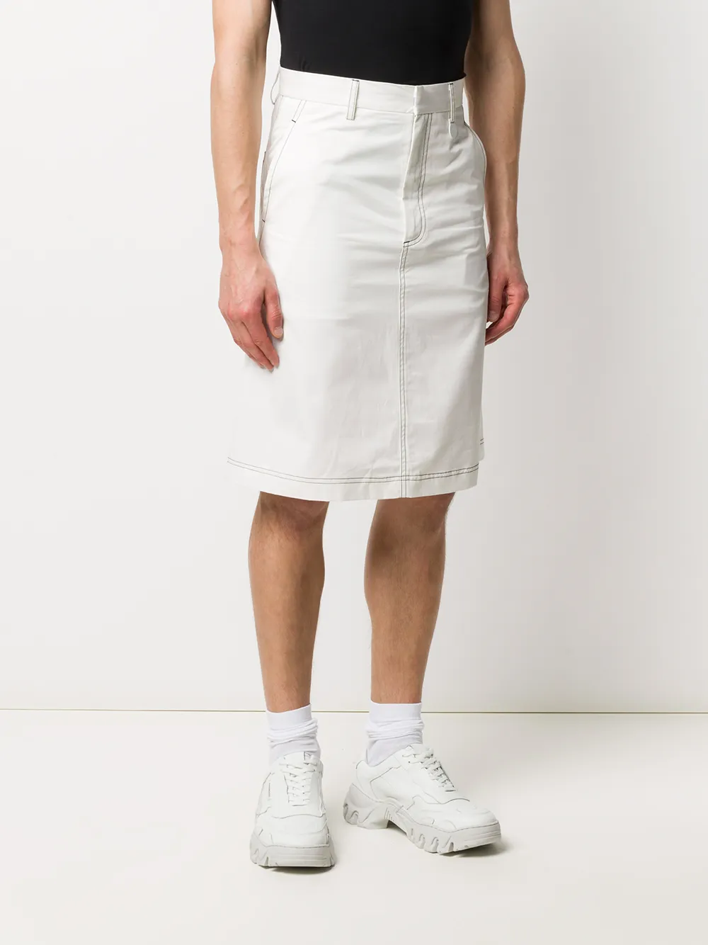 Контрастная строчка, петли для ремня, потайная застежка спереди, два вшитых кармана по бокам и длина по колено.