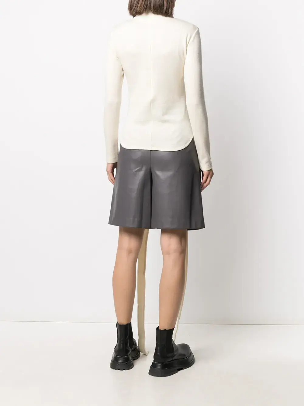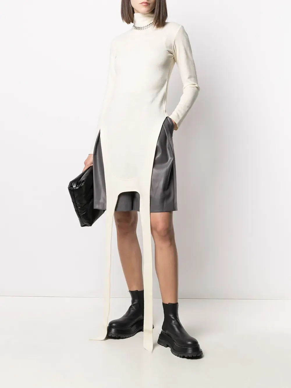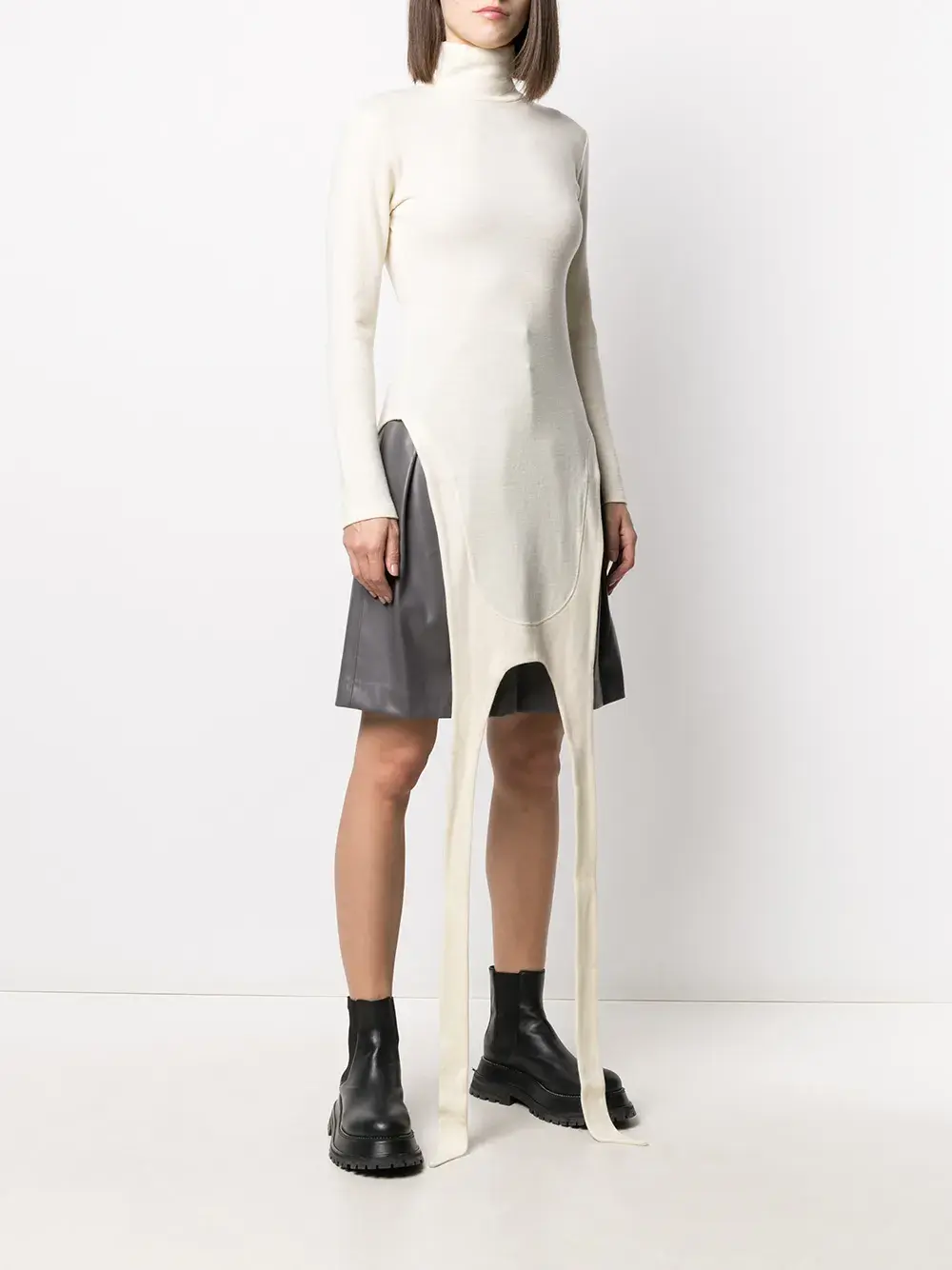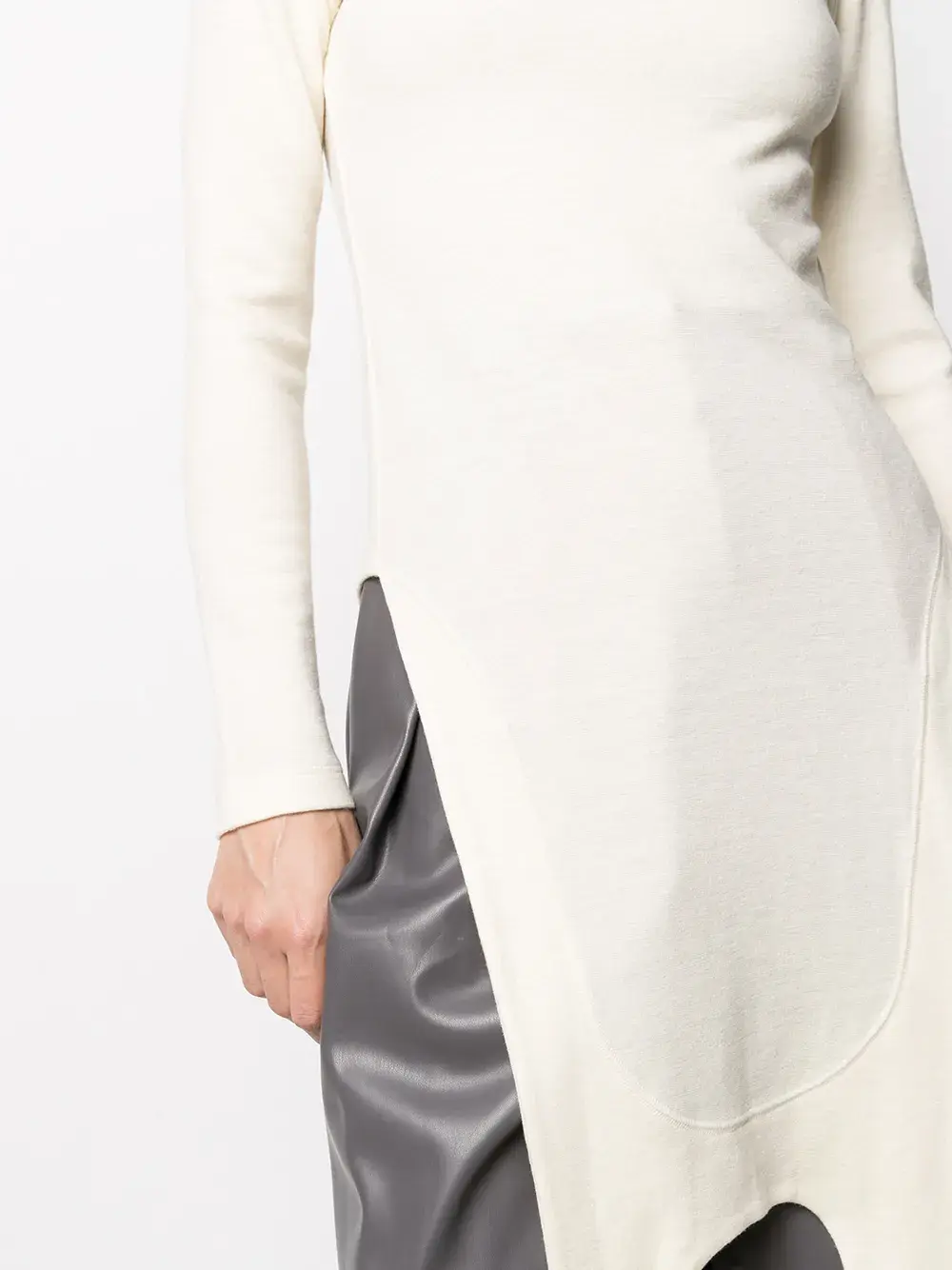 Ткань джерси, высокий воротник, длинные рукава и закругленный подол. Цвет: белый.