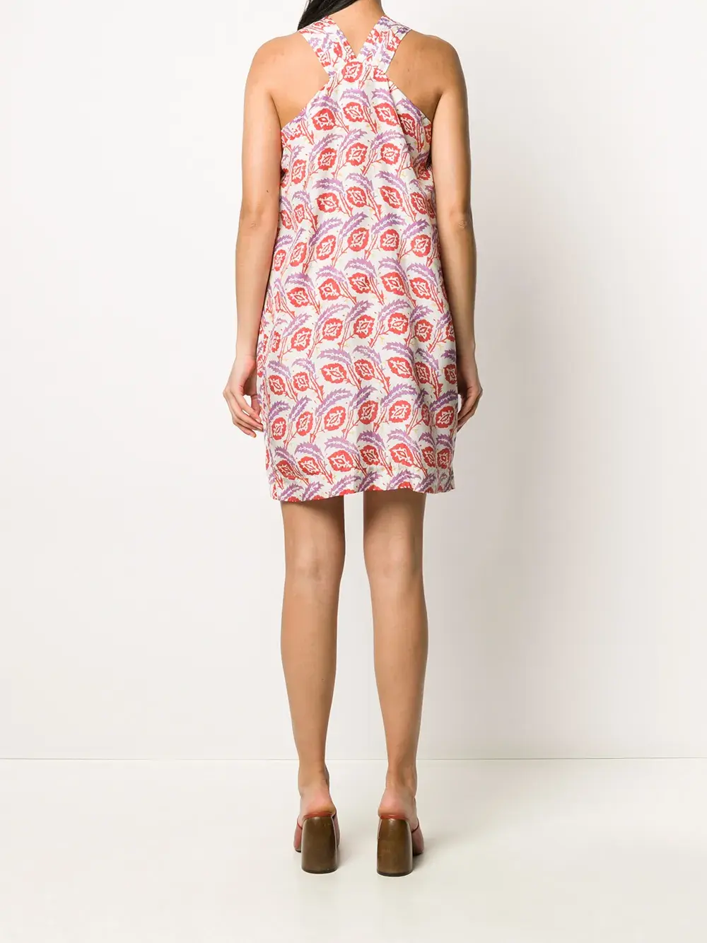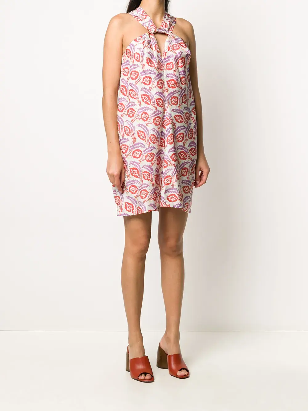 Принт с изображением листьев, вырез халтер, без рукавов и силуэт трапеция.