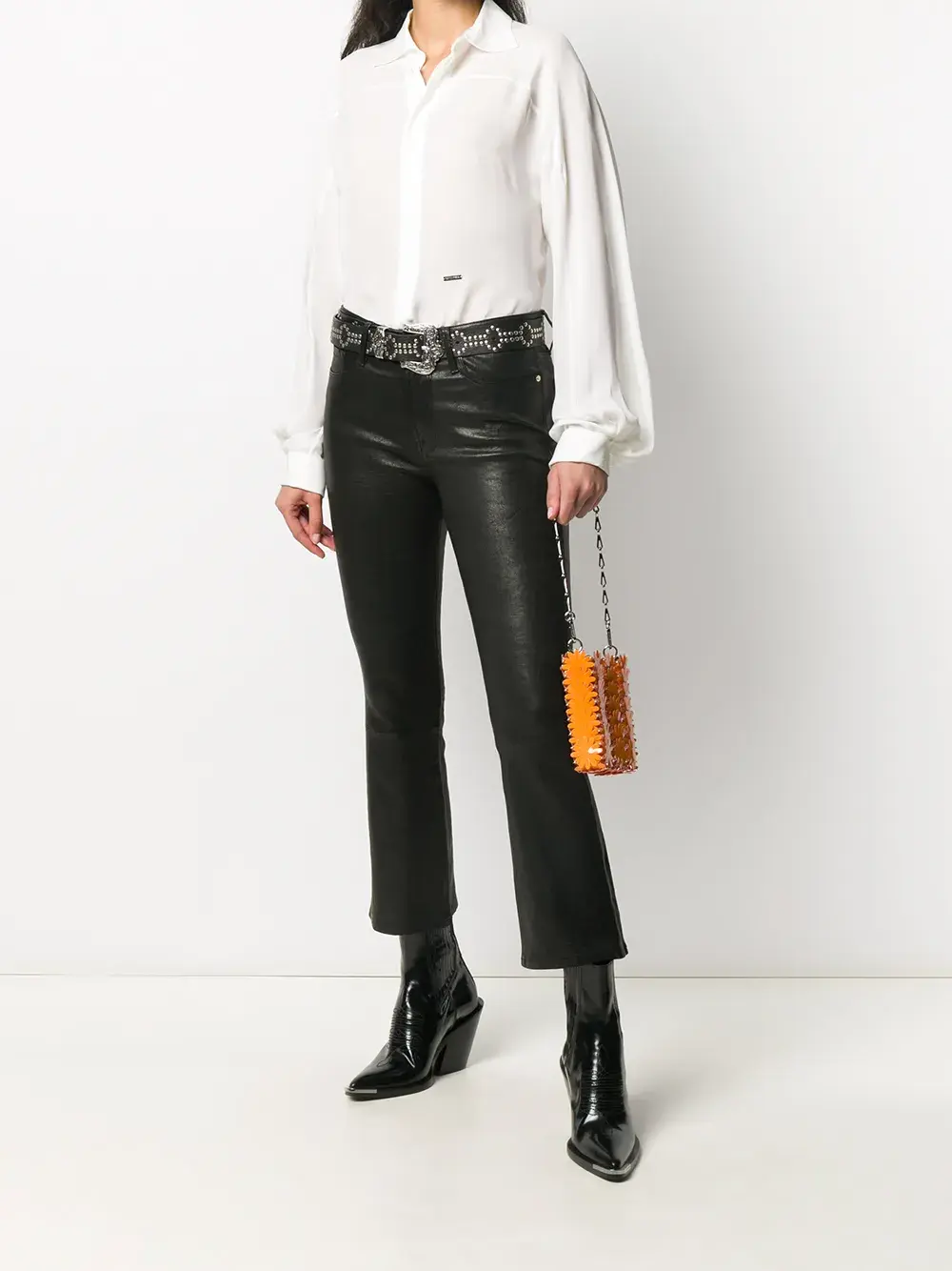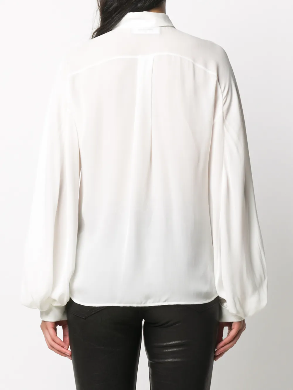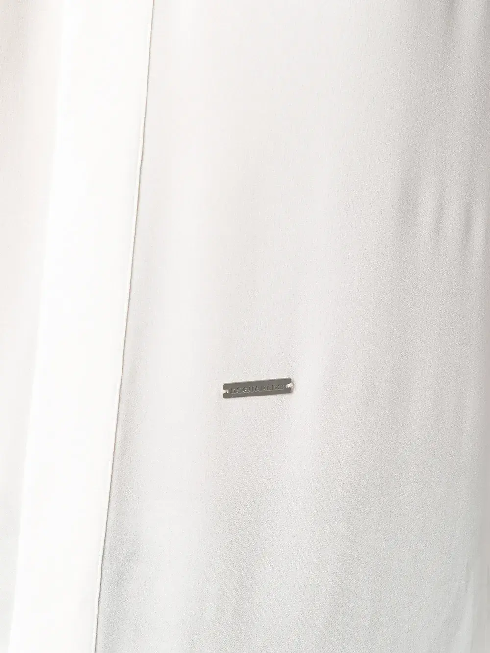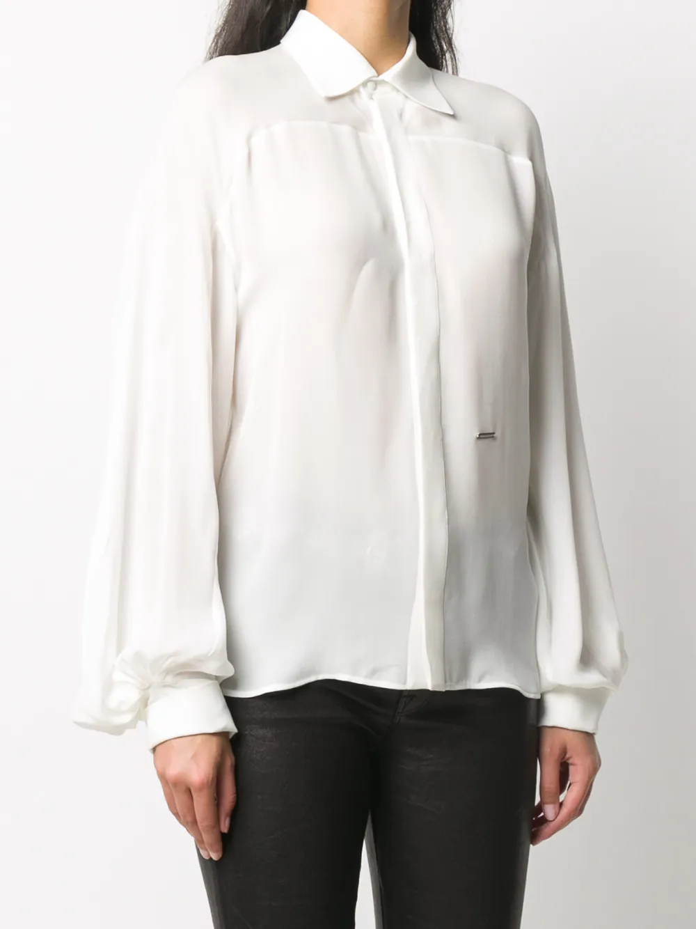 Серебристый металлический логотип, прямой воротник, потайная пуговичная застежка спереди и длинные рукава. Цвет: белый.