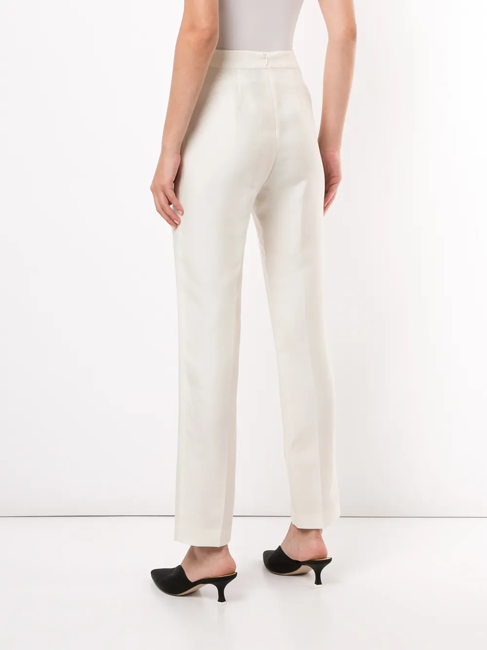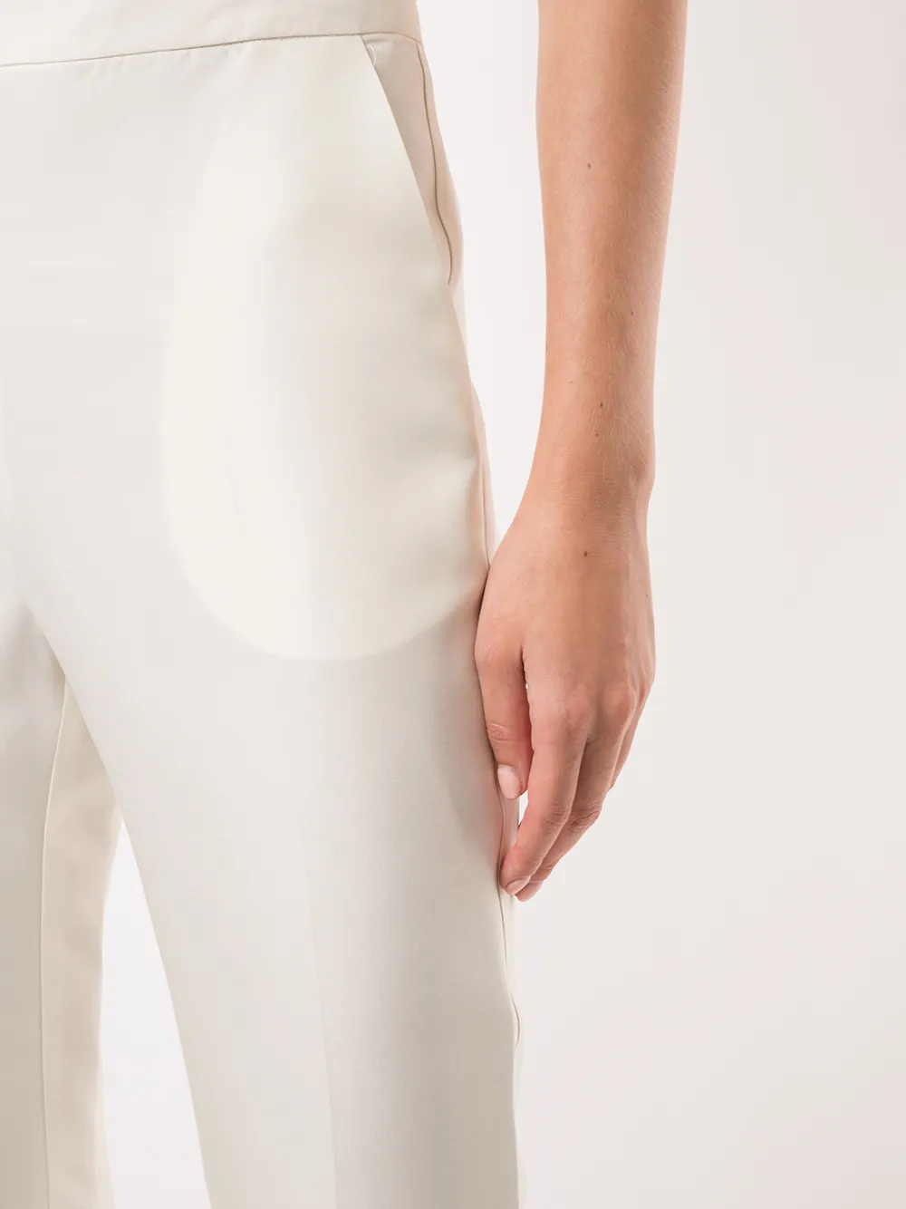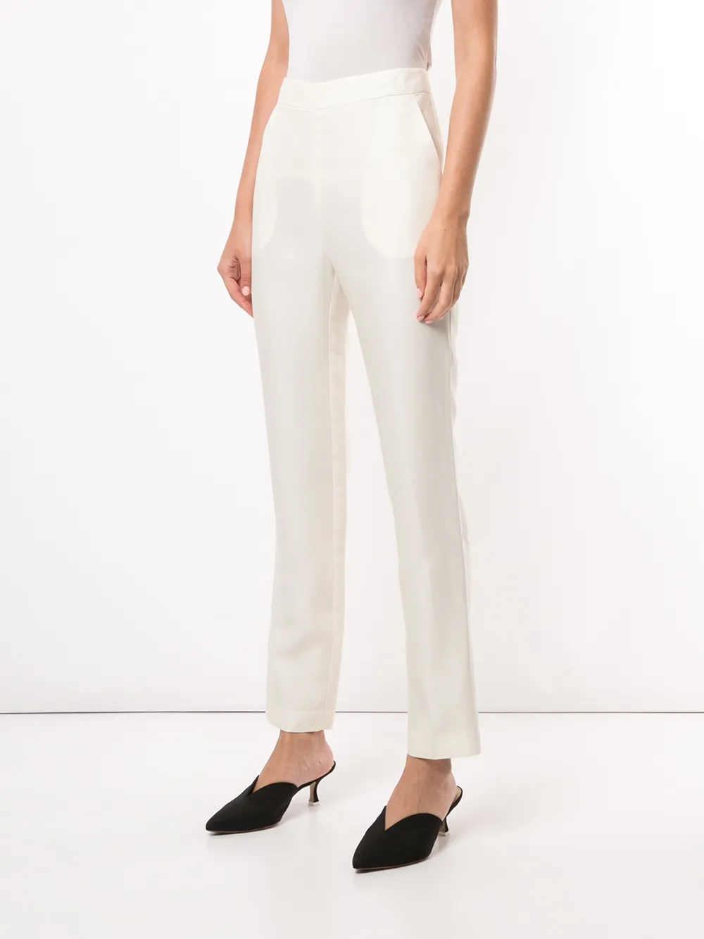 Два прорезных кармана по бокам, завышенная талия, прямой крой, потайная застежка сзади и узкий крой.