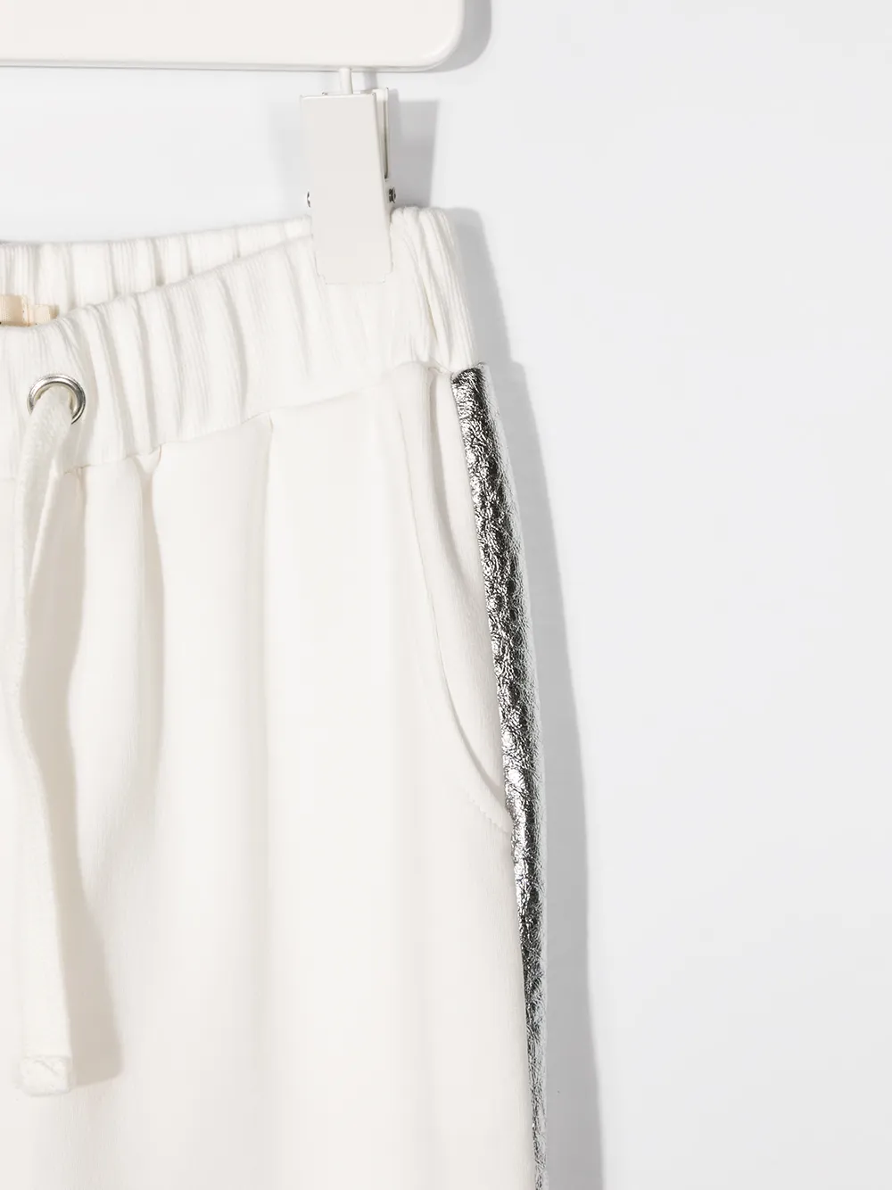 Отделка лентой с логотипом, эффект металлик, эластичный пояс, кулиска на талии и два прорезных кармана по бокам. Цвет: белый.