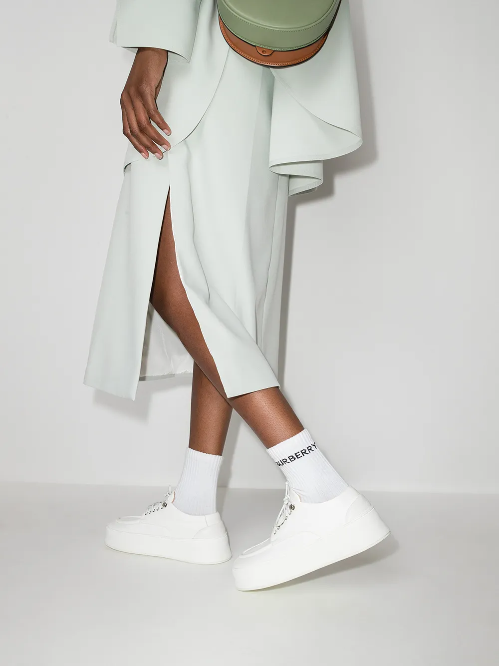 Закругленный носок, шнуровка спереди, стелька с логотипом и плоская резиновая подошва.
