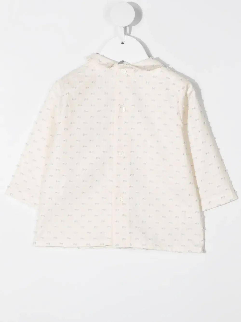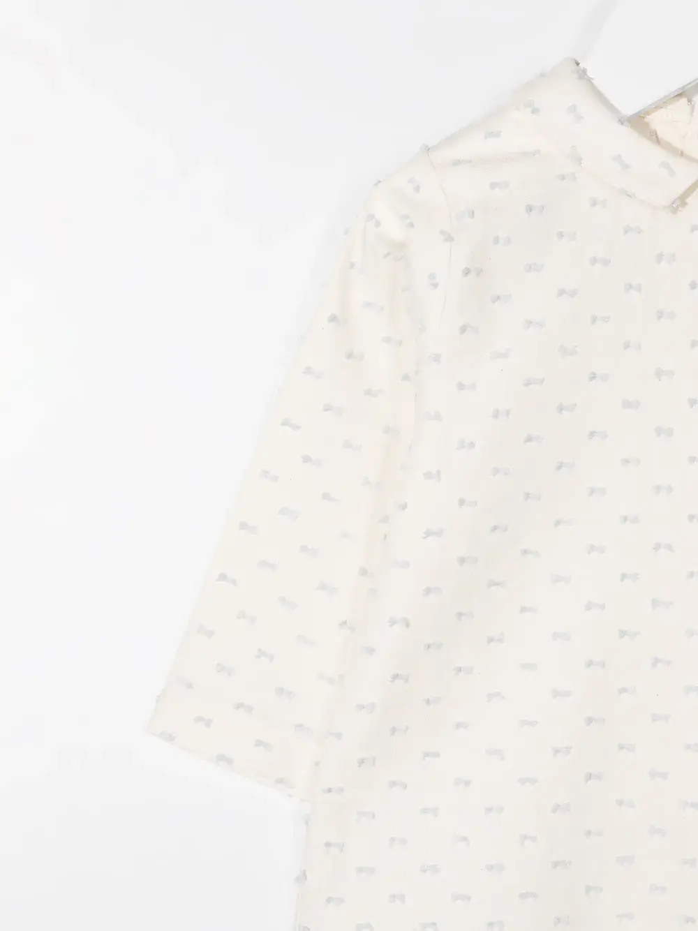 Воротник Питер Пэн, застежка на пуговицы сзади, длинные рукава и прямой подол.