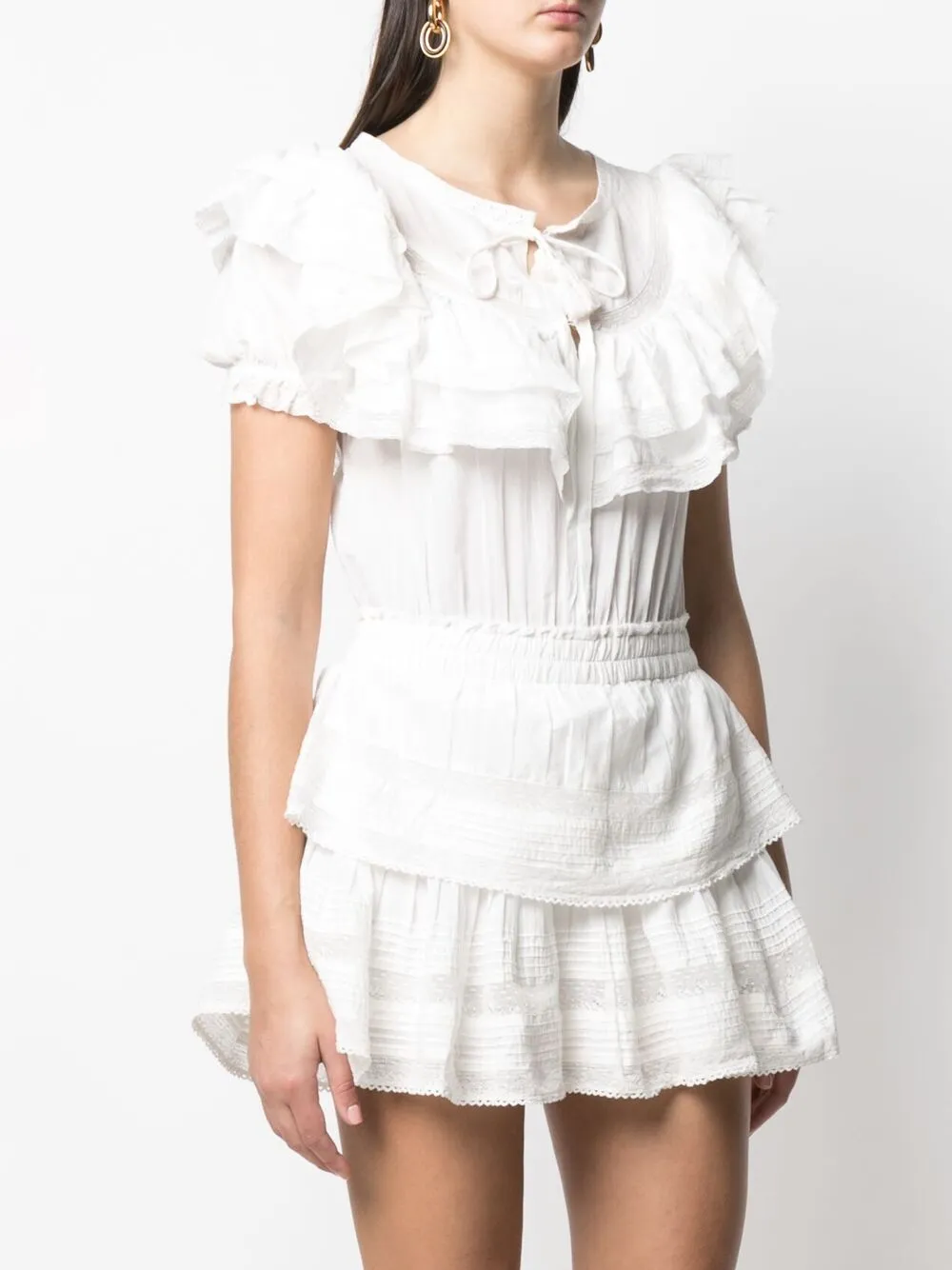 Вставки с оборками, завязки спереди и короткие рукава.