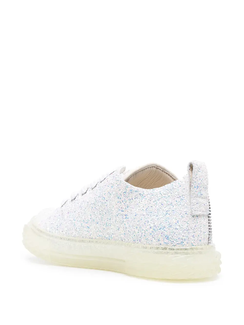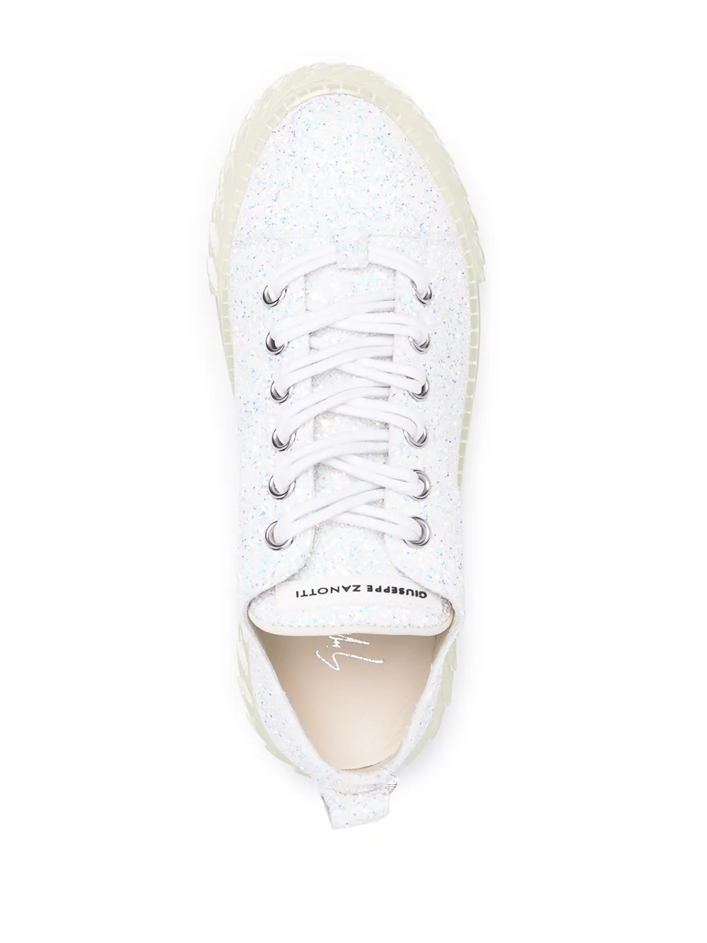 Деталь с блестками, нашивка с логотипом на язычке, закругленный носок, шнуровка спереди, стелька с логотипом и плоская резиновая подошва.