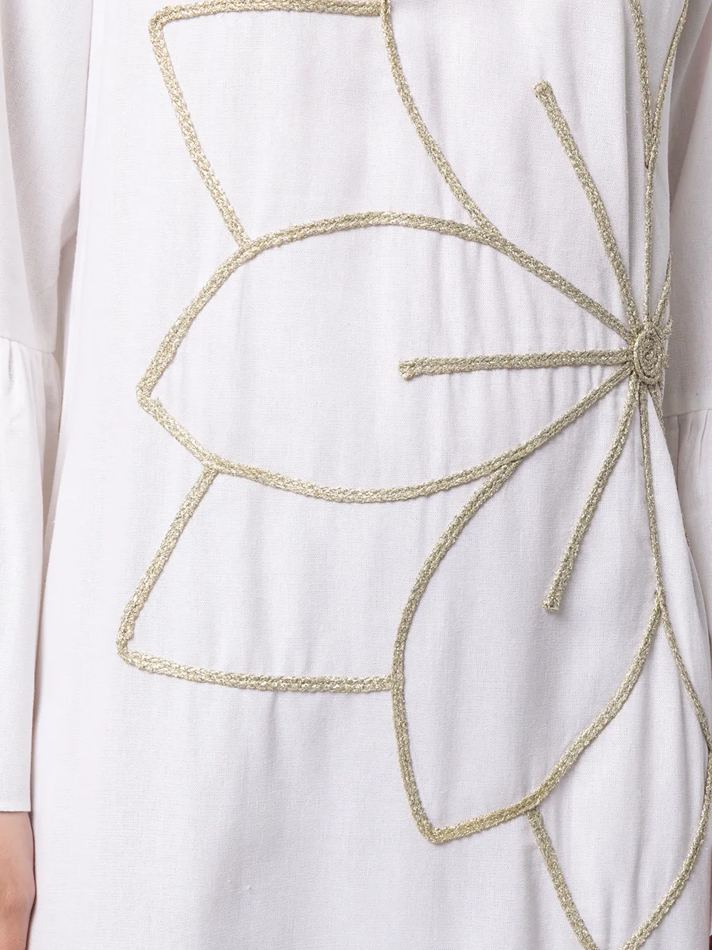 Расклешенный крой, цветочная вышивка, круглый вырез, застежка на молнии сзади, длинные рукава и длина миди.