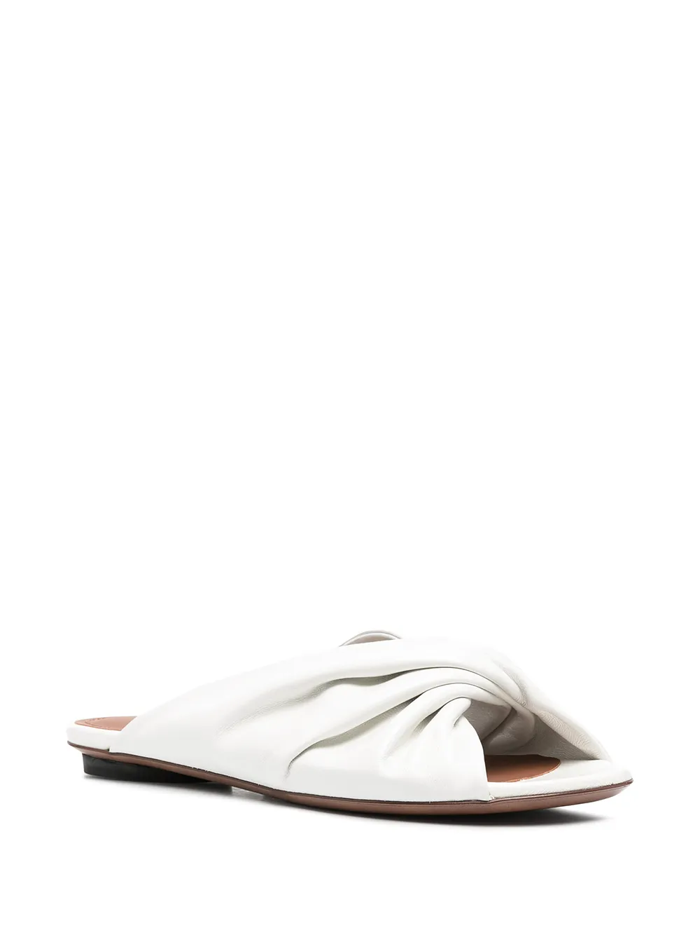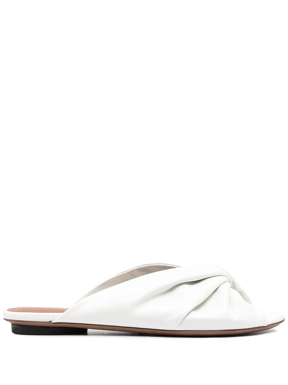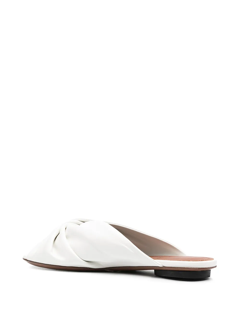 Перекрученная деталь, закругленный носок, открытый носок, стелька с логотипом, модель без застежки и плоская подошва. Цвет: белый.