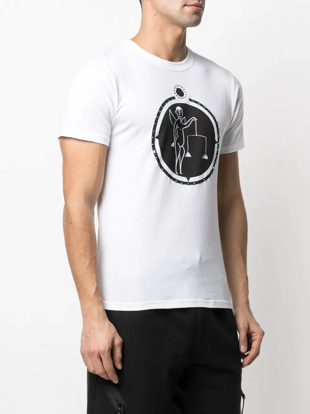 Графичный принт, круглый вырез, короткие рукава и прямой подол. Цвет: белый. Это унисекс-модель. Обратите внимание, что для нее используется мужская размерная сетка.