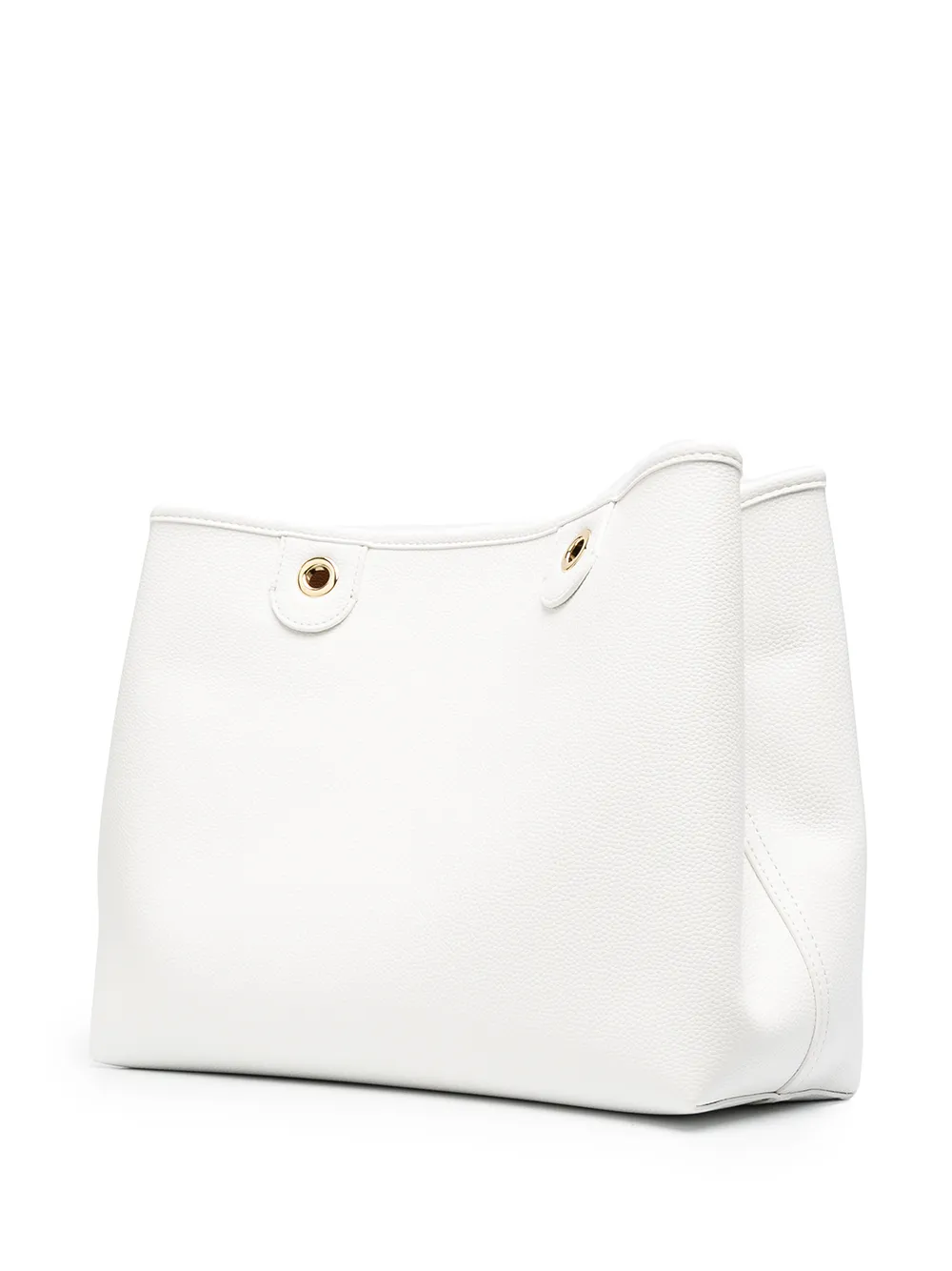 Зернистая текстура, ремень на плечо с логотипом, золотистый логотип, две закругленные ручки и потайная застежка на магните. Цвет: белый.