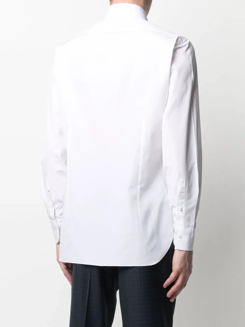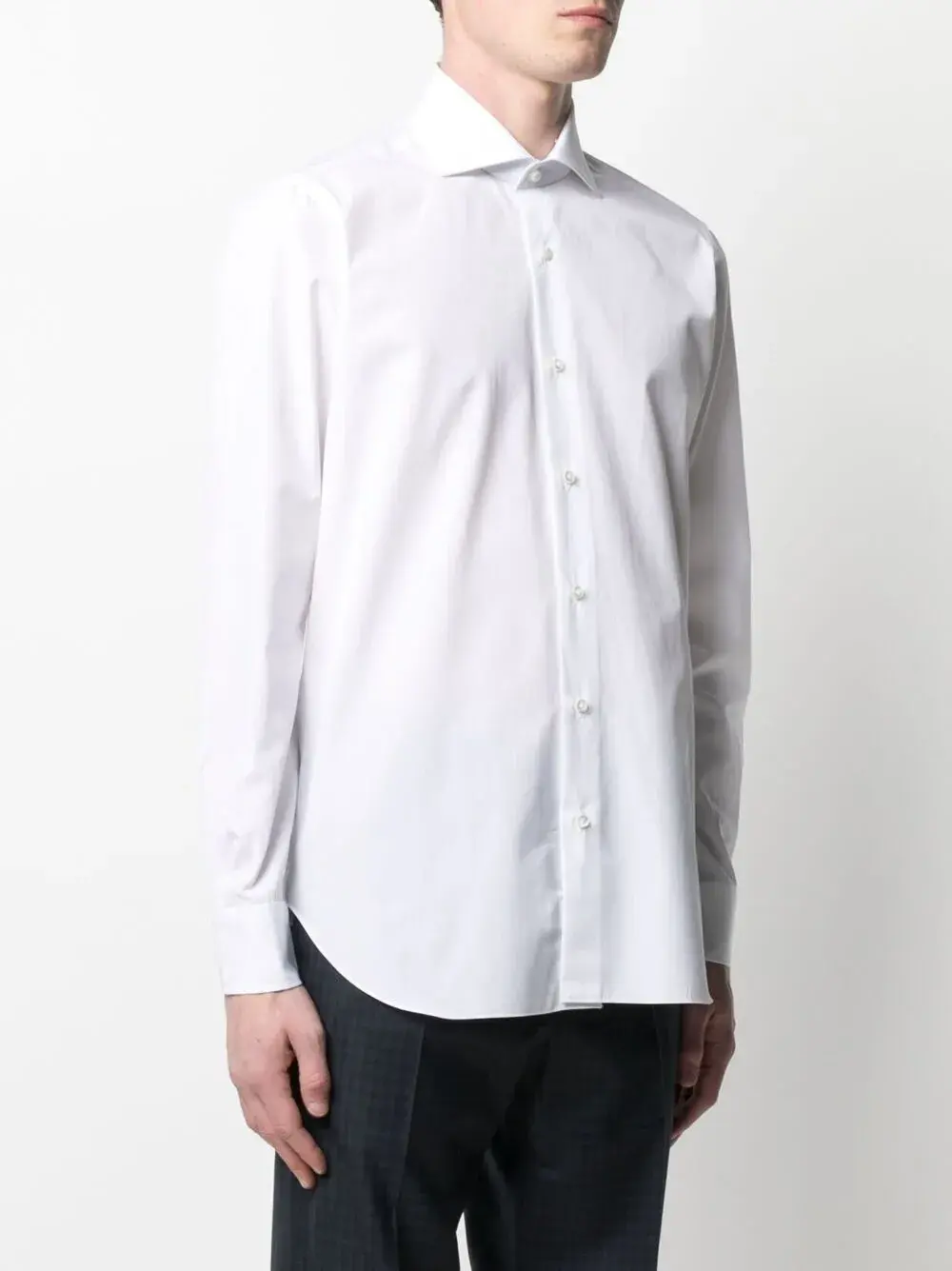 Косой воротник, застежка на пуговицах спереди, длинные рукава и закругленный подол. Цвет: белый.