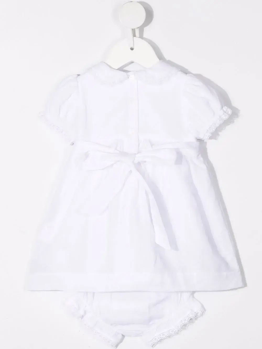 Воротник Питер Пэн, застежка на пуговицы сзади, застежка на завязке сзади и короткие рукава.