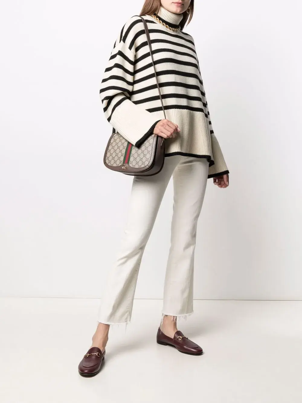 Расклешенные манжеты, завышенная линия талии, петли для ремня, потайная застежка на молнии и пуговицах, пять карманов и необработанные края. . Узнать больше о том, какие товары получают отметку «Ответственный выбор», можно из материала «Как мы оцениваем экологичность и этичность».