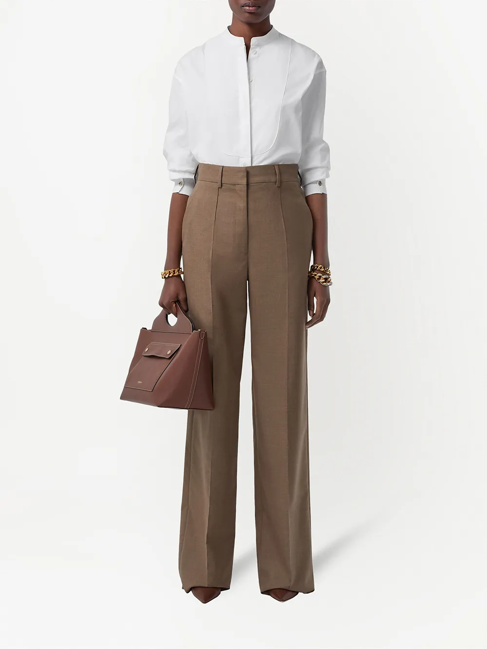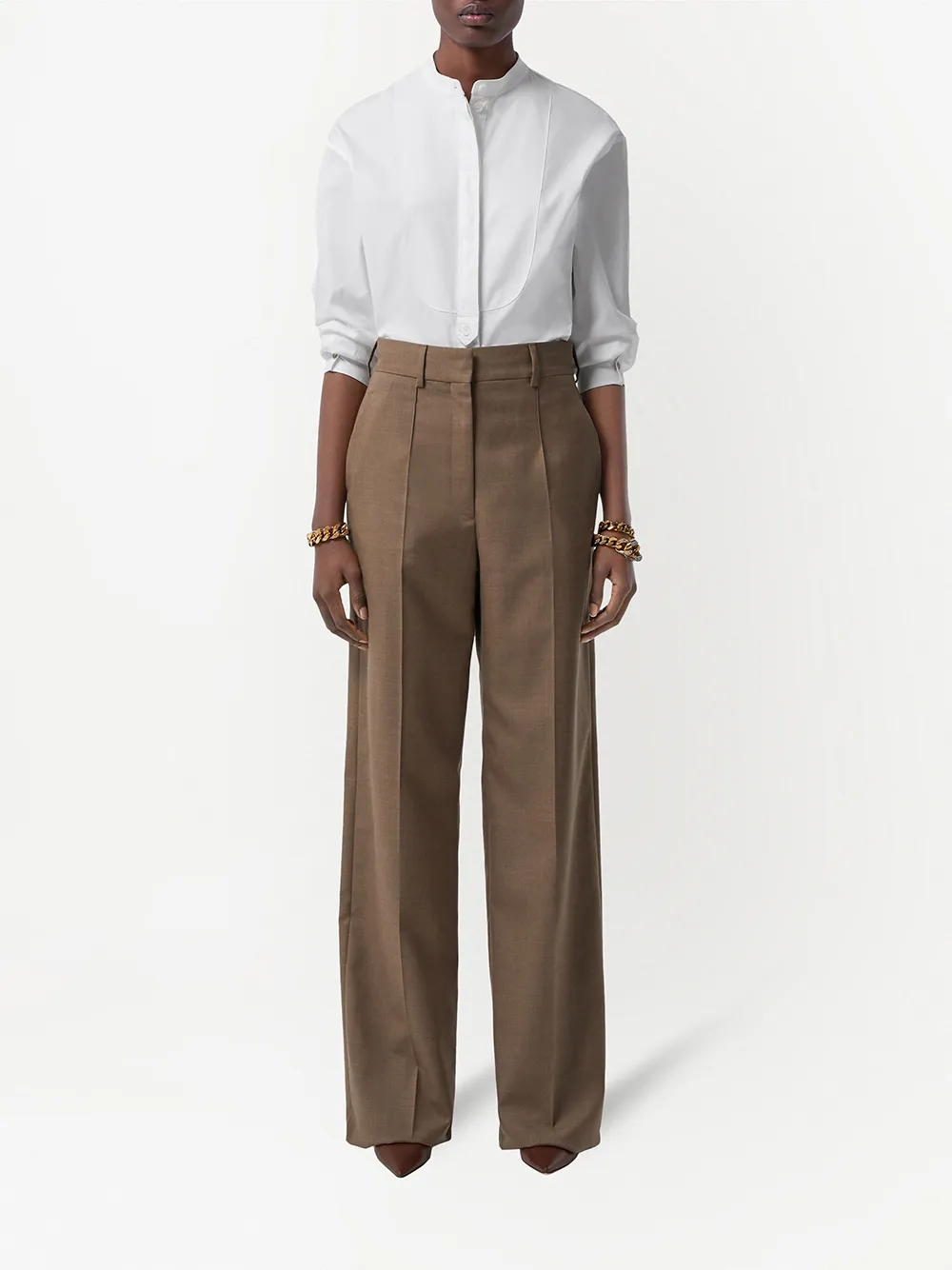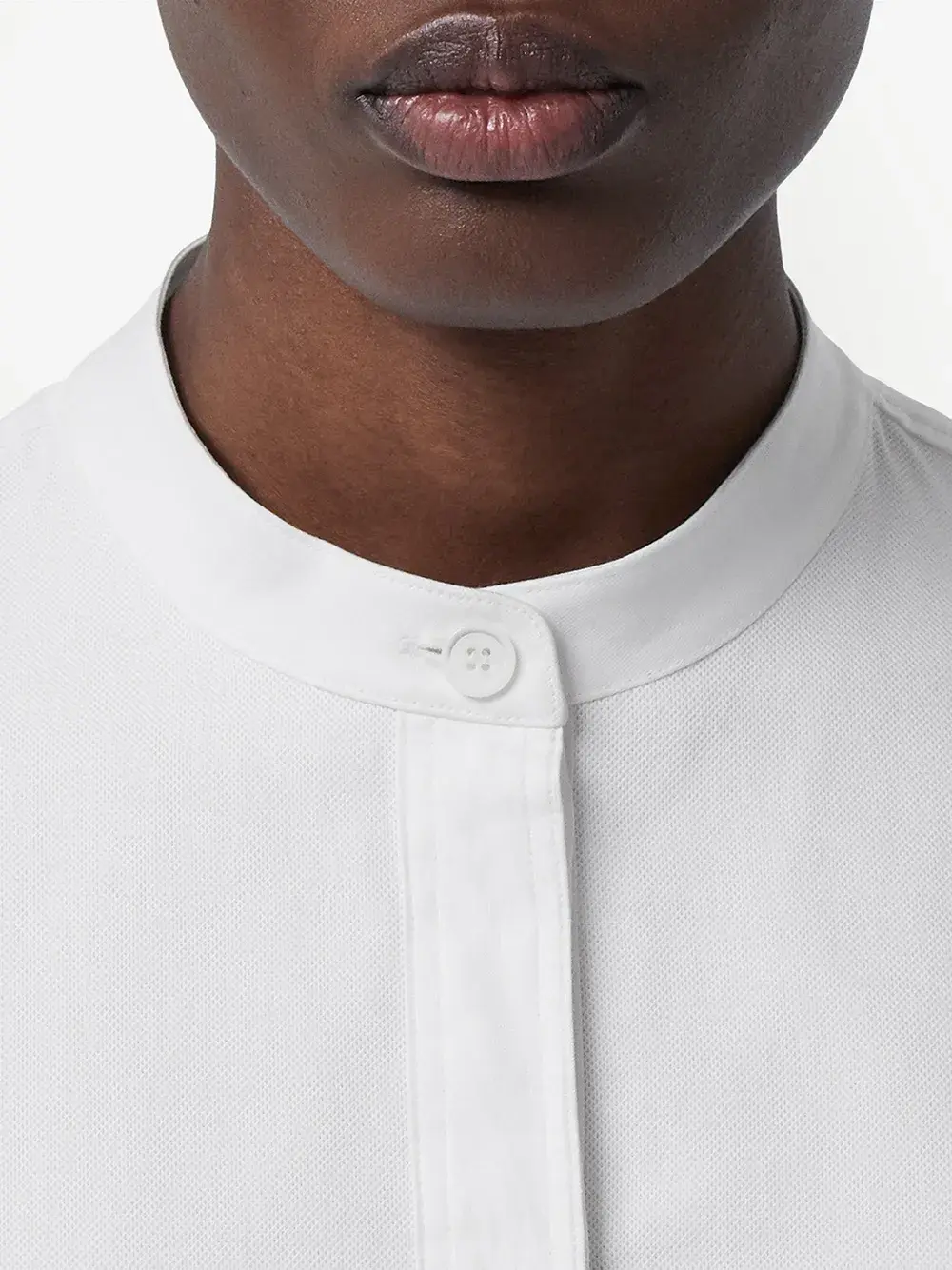 Плиссировка, перламутровые пуговицы, воротник-стойка, потайная пуговичная застежка спереди и манжеты на пуговицах.