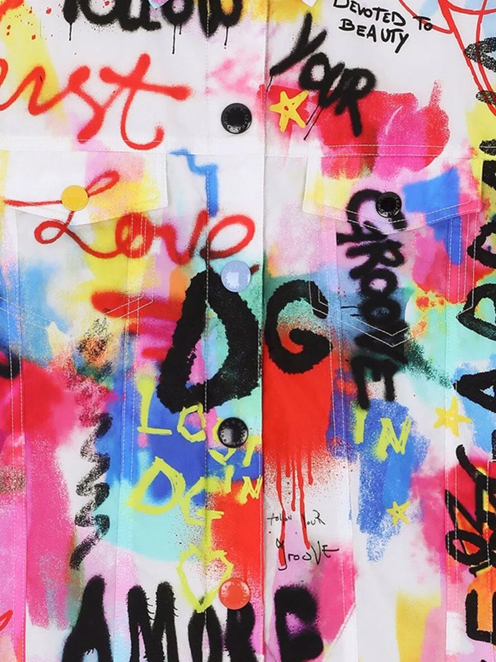 Принт граффити, классический воротник, застежка на заклепках, два нагрудных кармана с клапанами, длинные рукава, манжеты на пуговицах и два прорезных кармана по бокам.