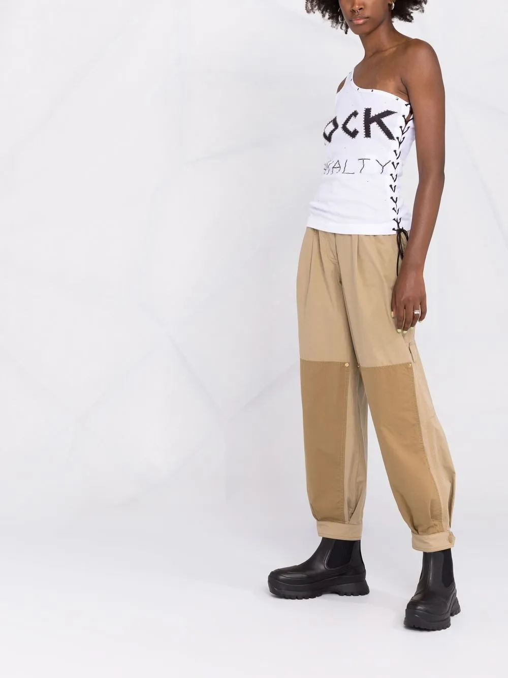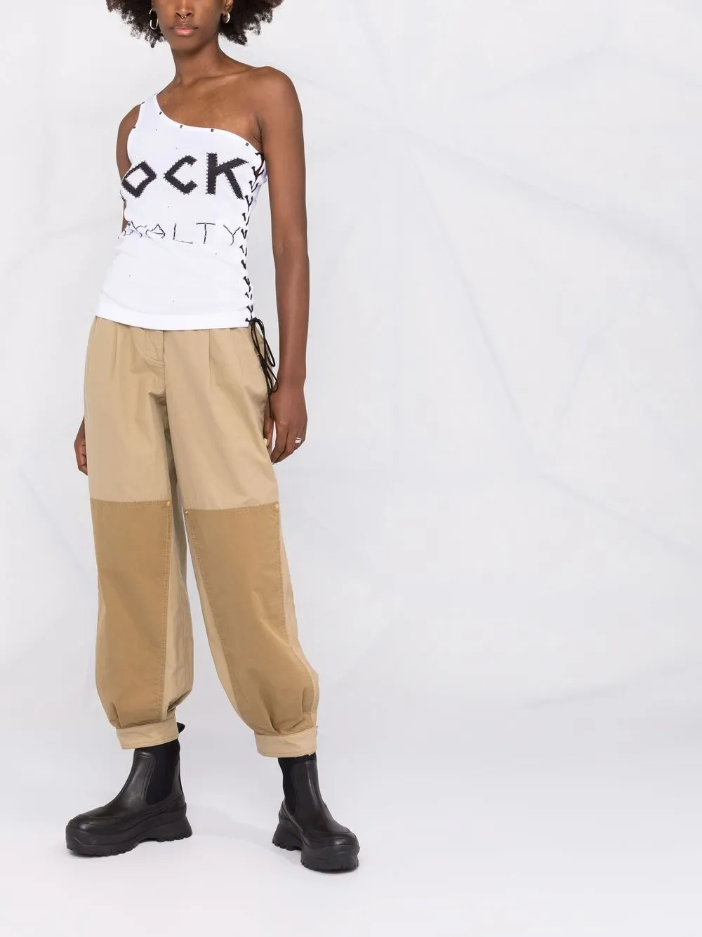 Серебристые заклепки, принт с надписью, шнуровка и модель на одном плече. Цвет: белый. Этот бренд получил хорошую оценку за использование этичных по отношению к животным практикам..