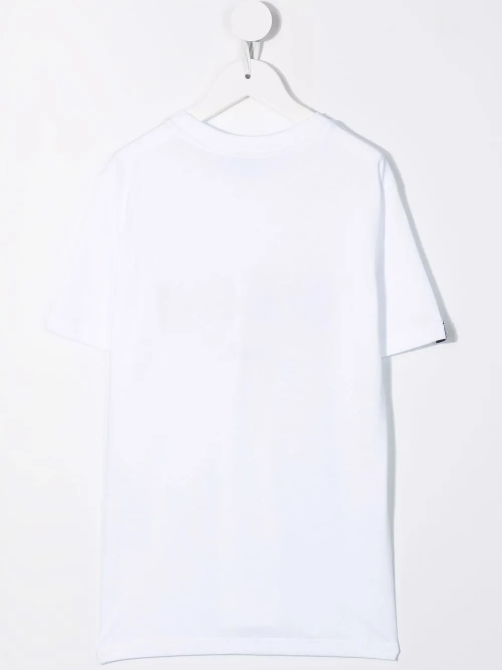 Логотип спереди, круглый вырез, короткие рукава и прямой подол. Цвет: белый.