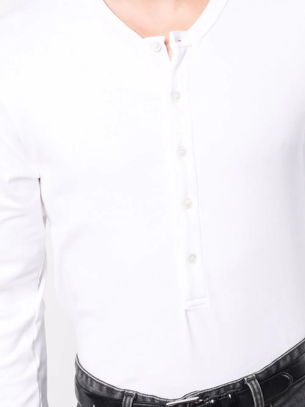 Ткань джерси, вырез хенли, планка на пуговицах спереди, длинные рукава и прямой подол. Цвет: белый.