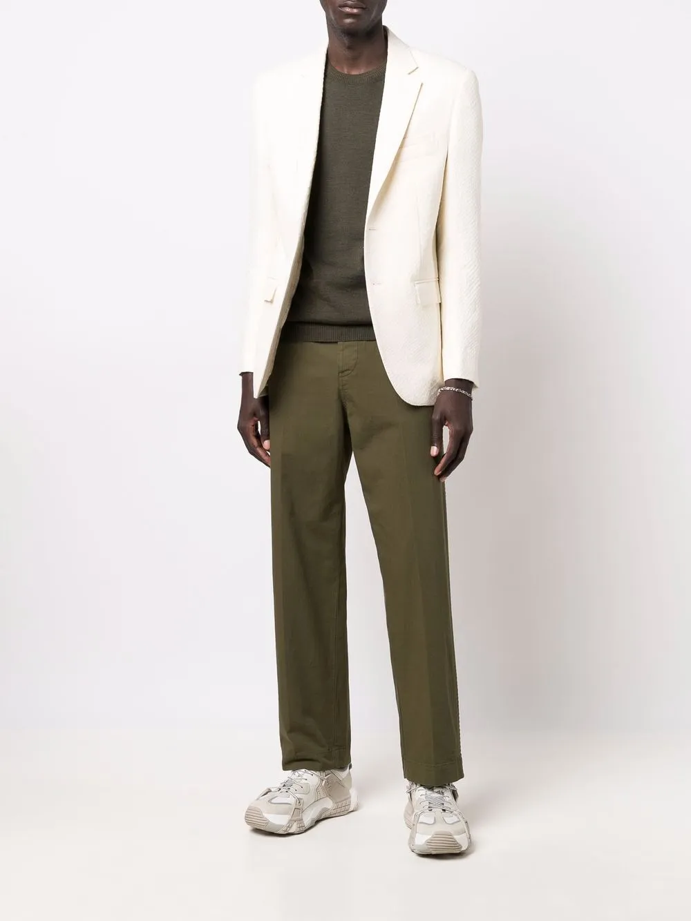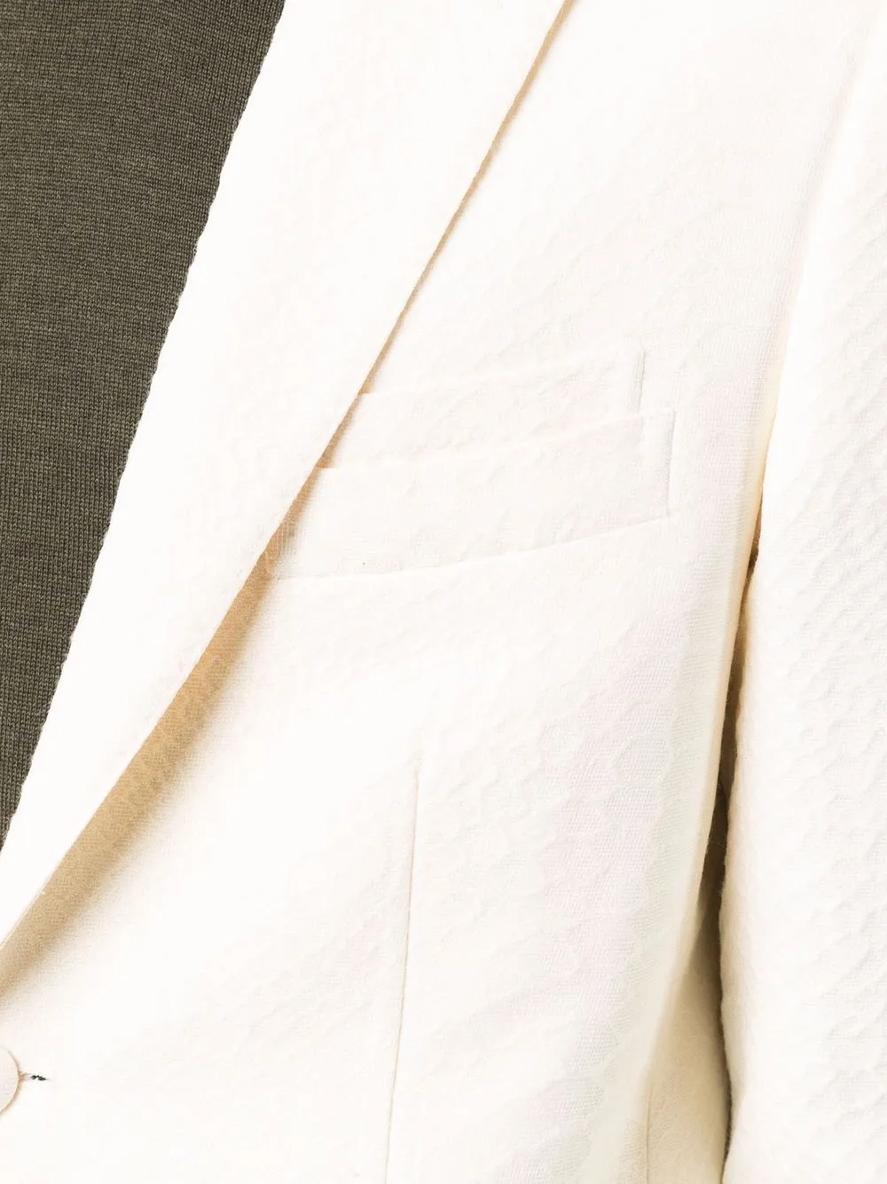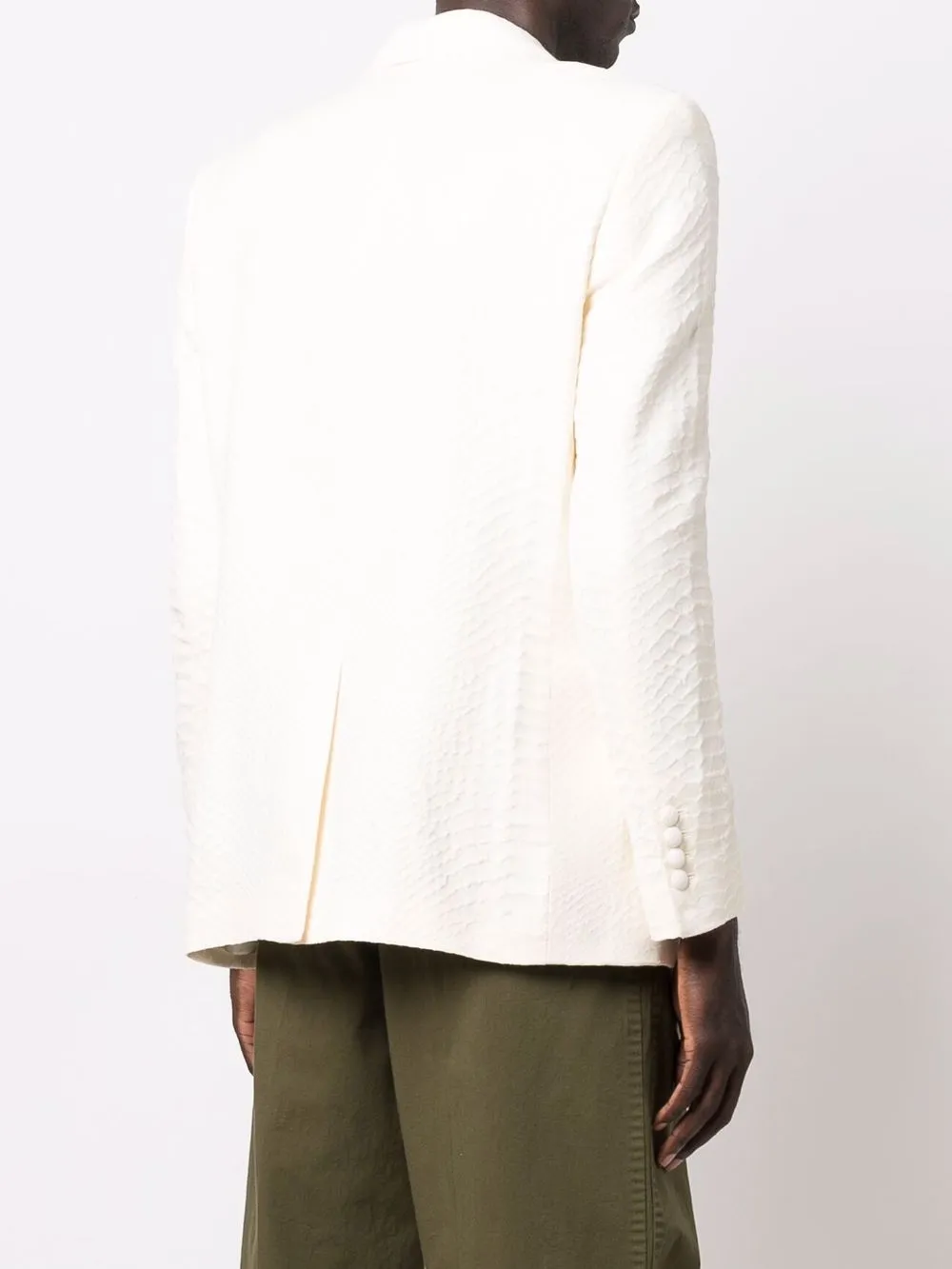 Тиснение под кожу крокодила, жаккардовая модель, зазубренные лацканы, застежка на пуговицах спереди, длинные рукава, прорезной карман на груди, манжеты на пуговицах, два передних кармана с клапанами, шлица по центру сзади и строгий крой. Цвет: белый.