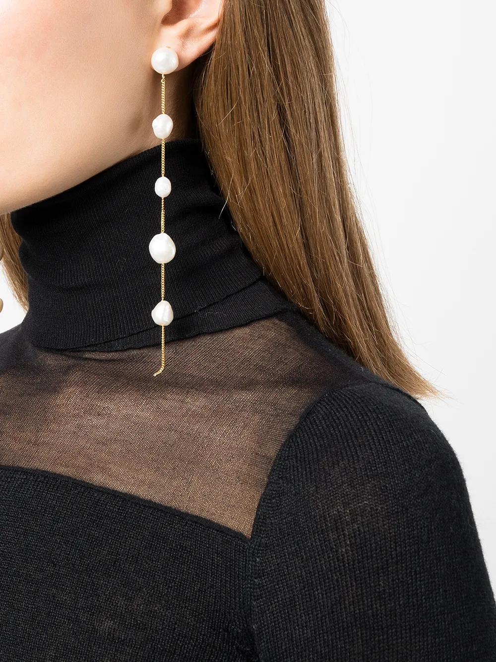 Детали с жемчугом, тонкая цепочка и застежка-бабочка. В комплект входят две серьги. Украшения с жемчугом требуют особого ухода и бережного обращения. Избегайте контакта жемчуга с отбеливателями, парфюмом и косметическими средствами. Чтобы почистить изделие с жемчугом, протрите его мягкой тканью.