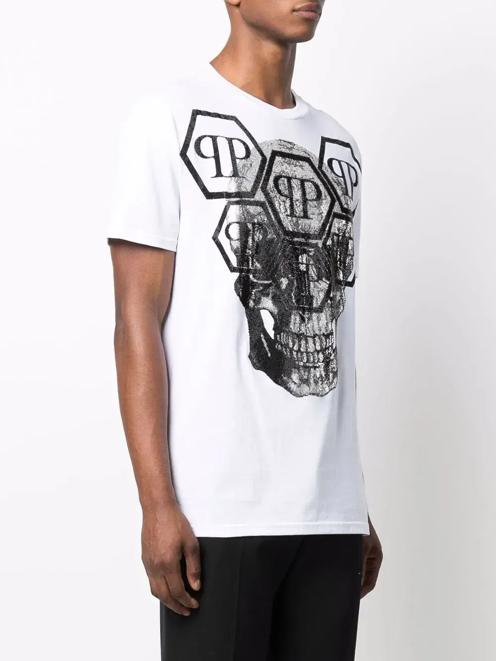 Принт с изображением черепа спереди, декор из кристаллов, логотип спереди, металлический логотип, круглый вырез, короткие рукава и прямой подол. Цвет: белый.