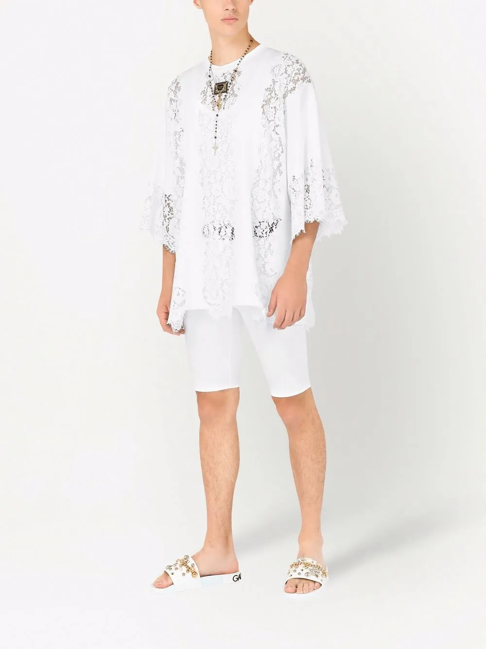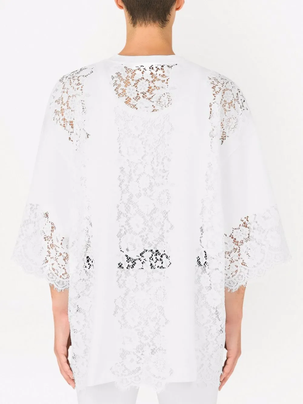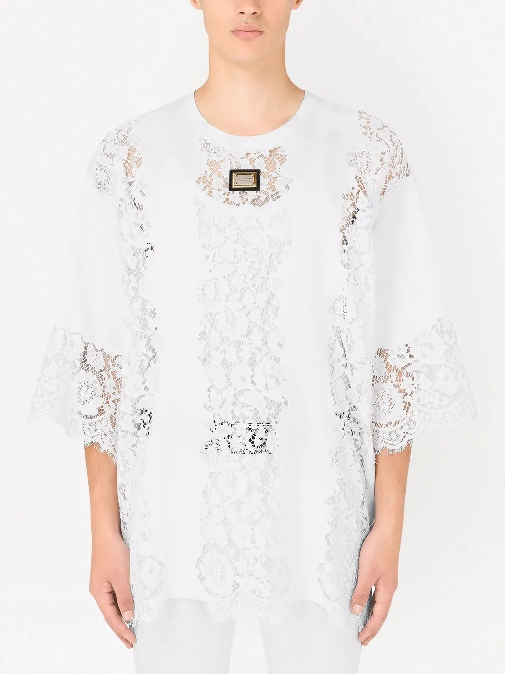Кружевные вставки, металлический логотип, круглый вырез, кружевная отделка и рукава три четверти.