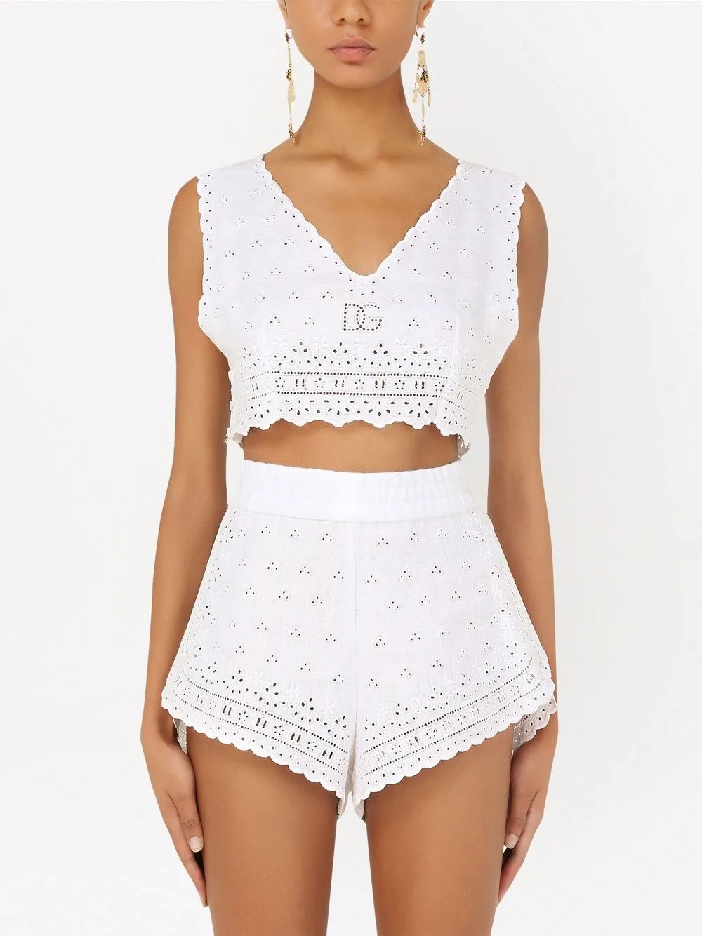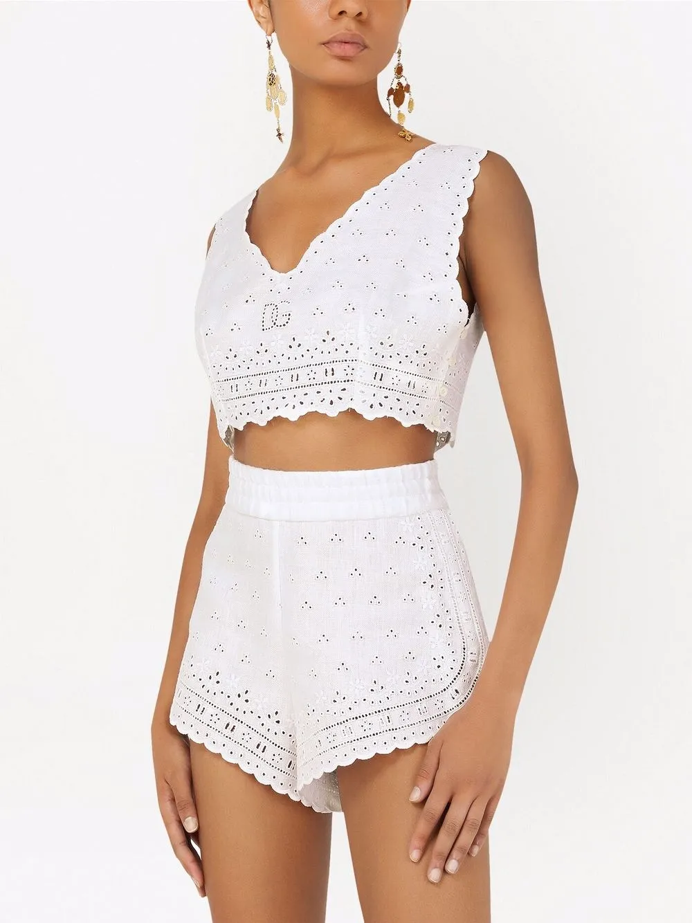 Английская вышивка, V-образный вырез, без рукавов, края с фестонами и укороченная длина. .