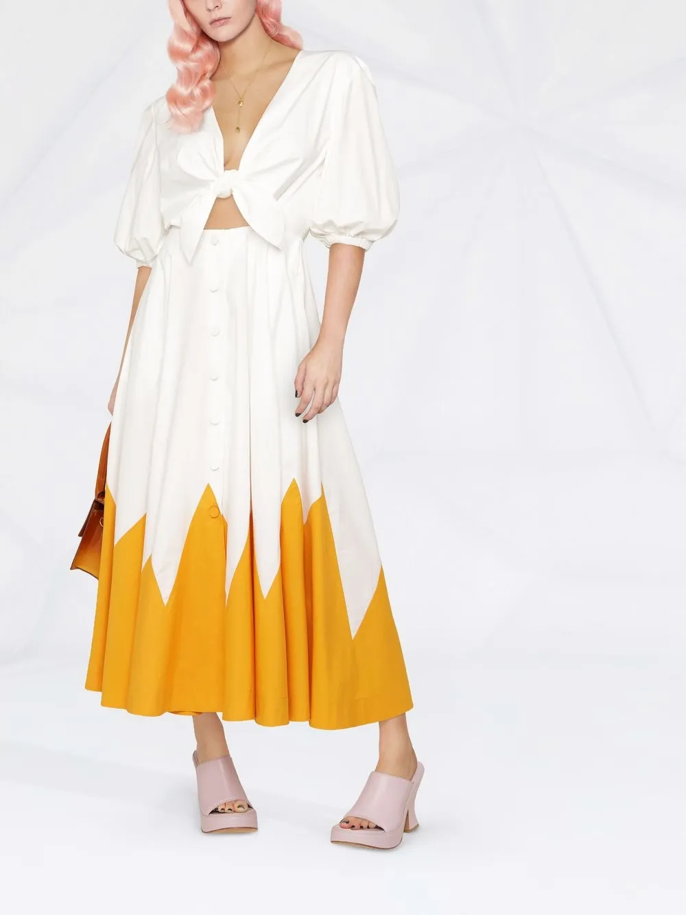 V-образный вырез, завязки спереди, вырезные детали, короткие объемные рукава, застежка на пуговицах спереди и А-образный силуэт.