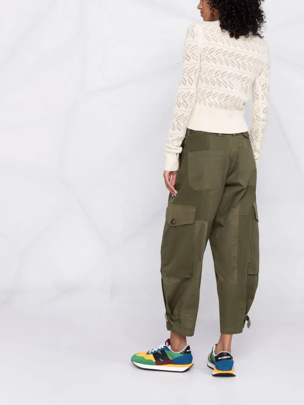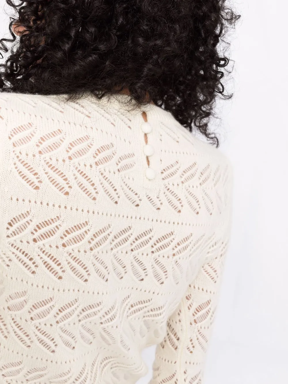 Ажурная вязка, круглый вырез, застежка на пуговицы сзади, длинные рукава, манжеты в рубчик и подол в рубчик.