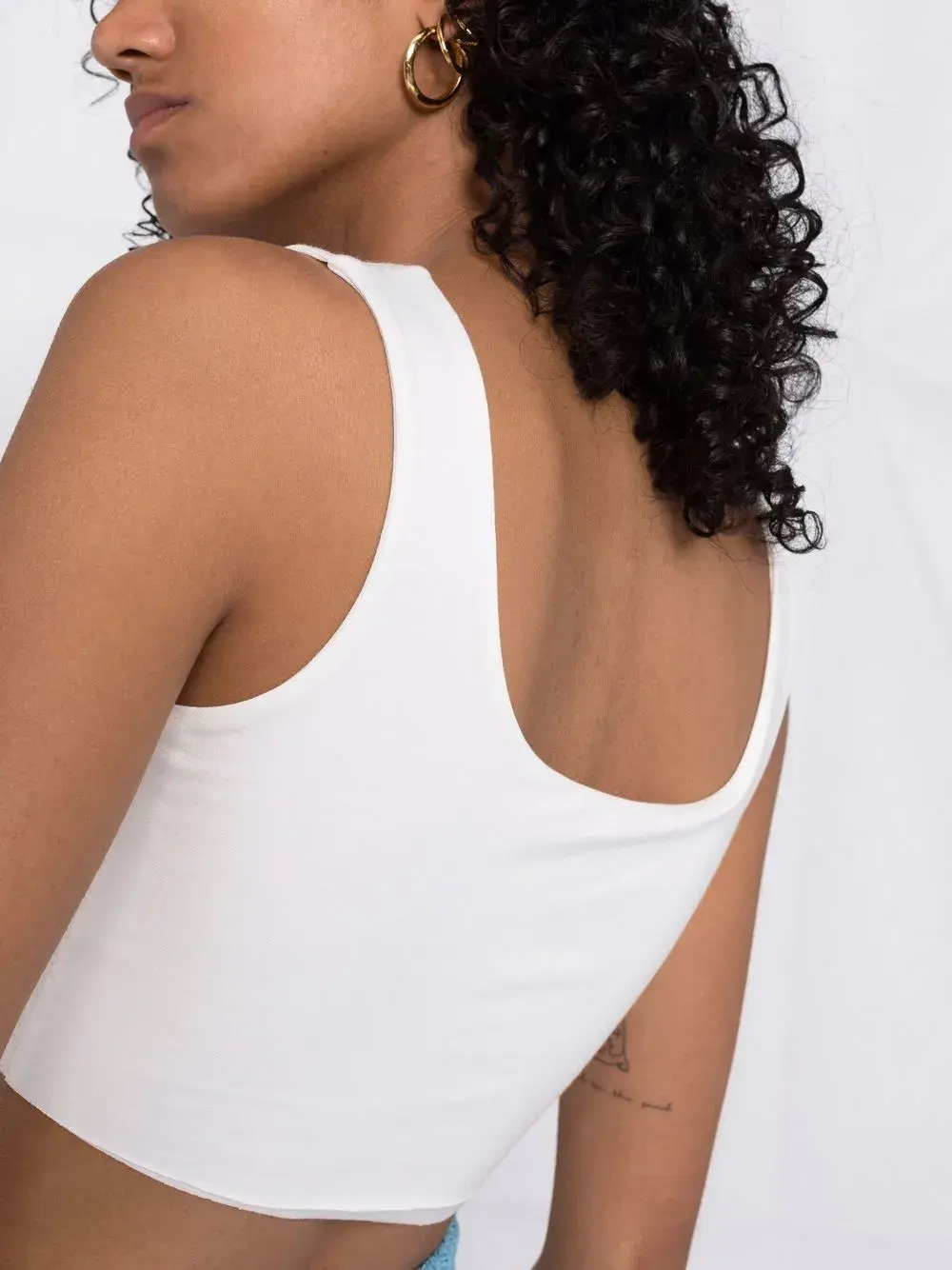 U-образный вырез, без рукавов и укороченная длина. Цвет: белый.