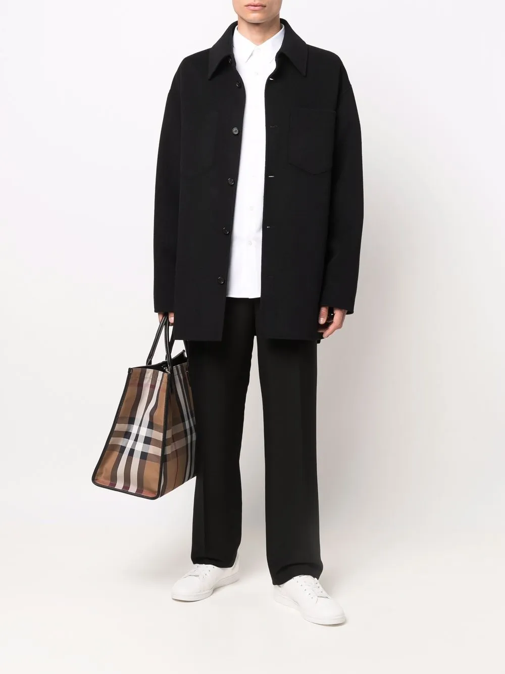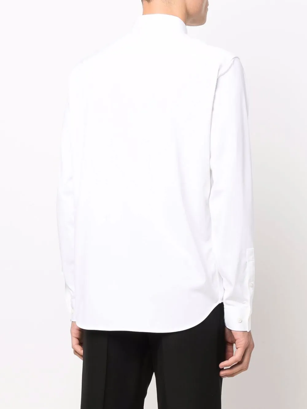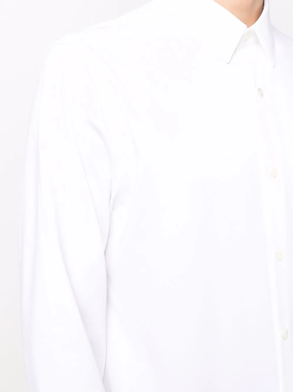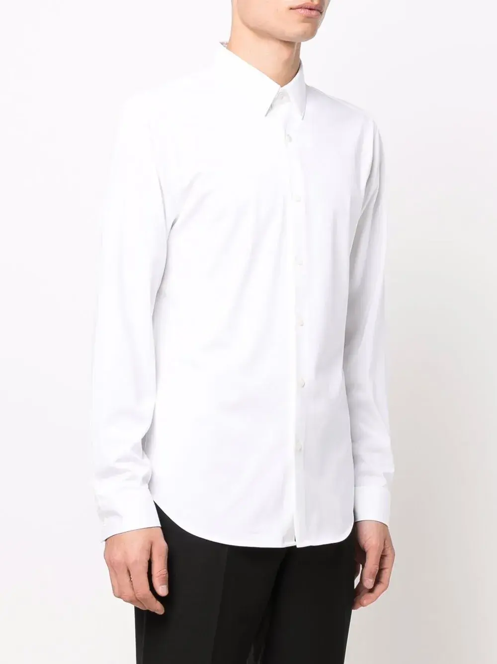 Защипы, плоский заостренный воротник, застежка на пуговицах спереди, длинные рукава, манжеты на пуговицах и узкий крой. Цвет: белый.